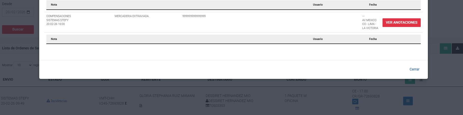 • Responsables de la incidencia figuran la terminal de origen, destino, Huachipa (terminal de operaciones) y Apoyo Social cuando no corresponde a ninguna agencia. Obligatorio