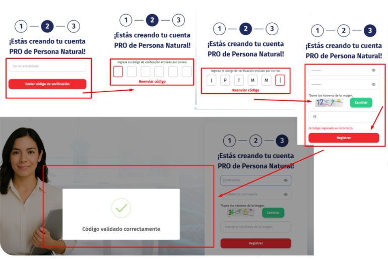 Interfaz: Esta acción redirige al usuario al primer paso del formulario de registro titulado: "¡Estás creando tu cuenta PRO de Persona Natural!".
