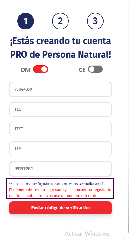 Mensaje de Error: Se despliega una alerta en texto rojo que indica: "El número de celular ingresado ya se encuentra registrado en otra cuenta. Por favor, use un número diferente".