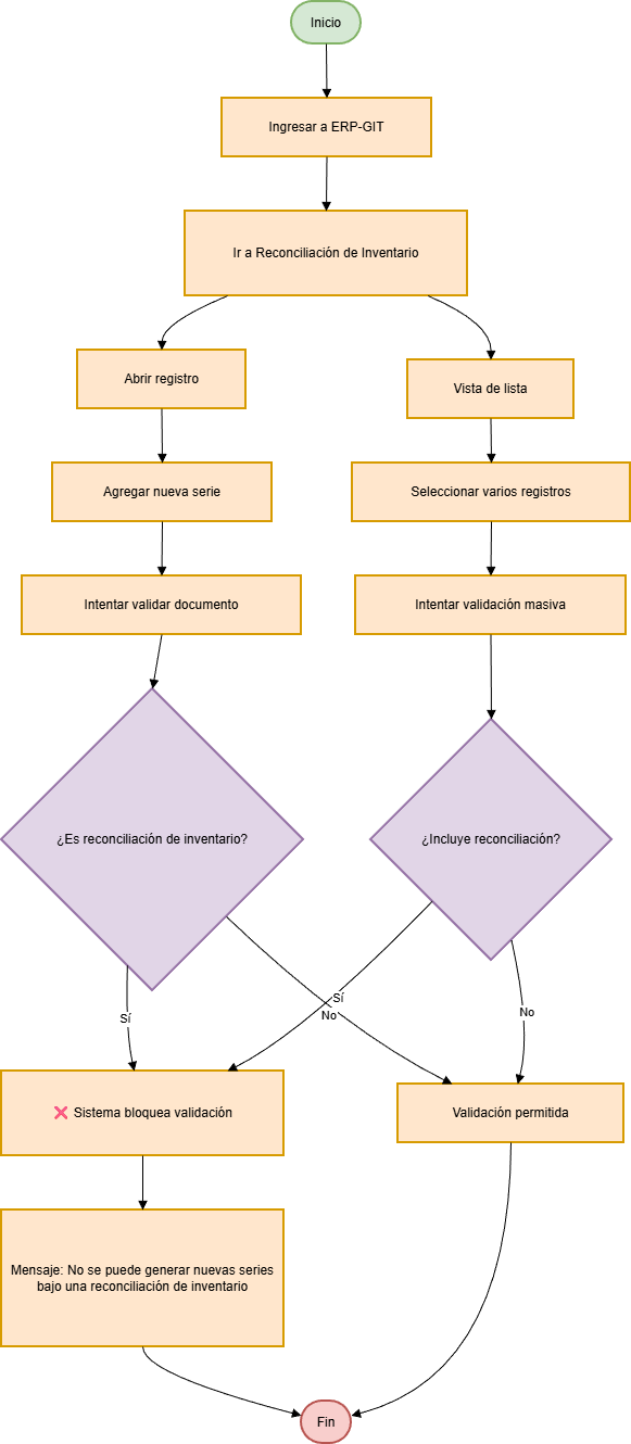- Si el usuario intenta crear nuevas series desde una Reconciliación de Inventario, el sistema no debe permitir la validación del documento.