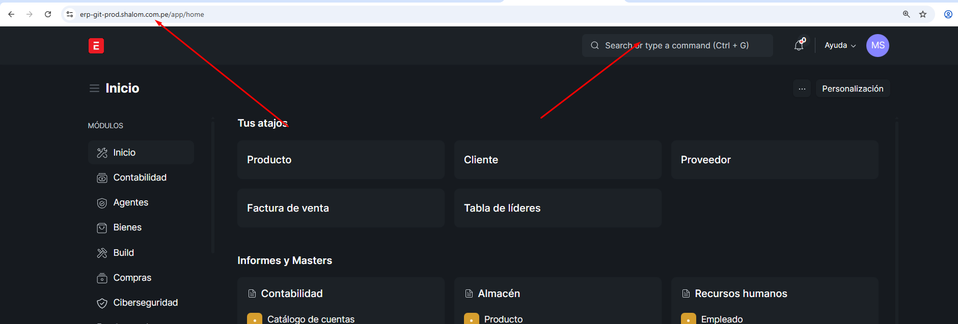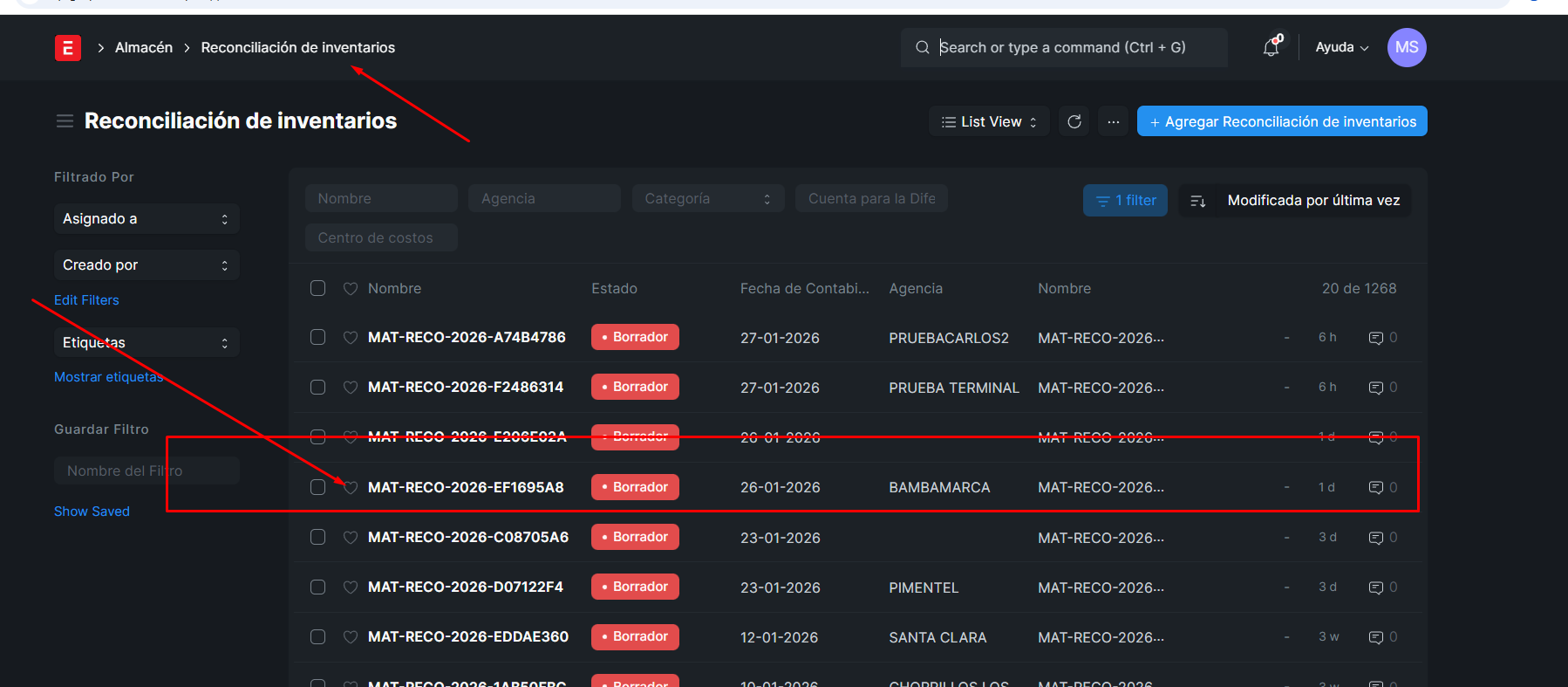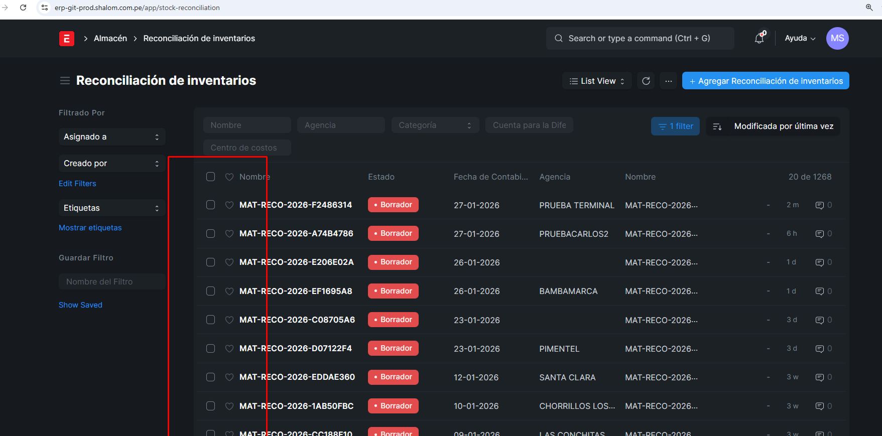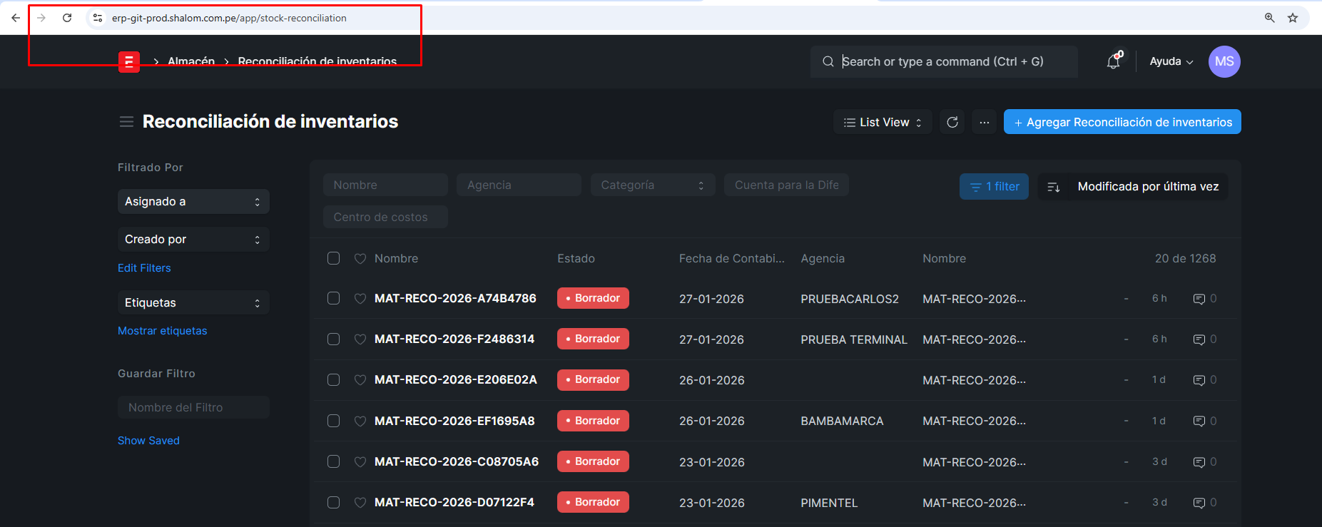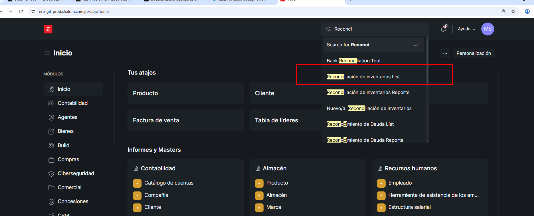 5.1 ingresamos al apartado erp-git e iniciamos sesión con nuestro usuario, buscamos el apartado Reconciliación de Inventario e ingresamos