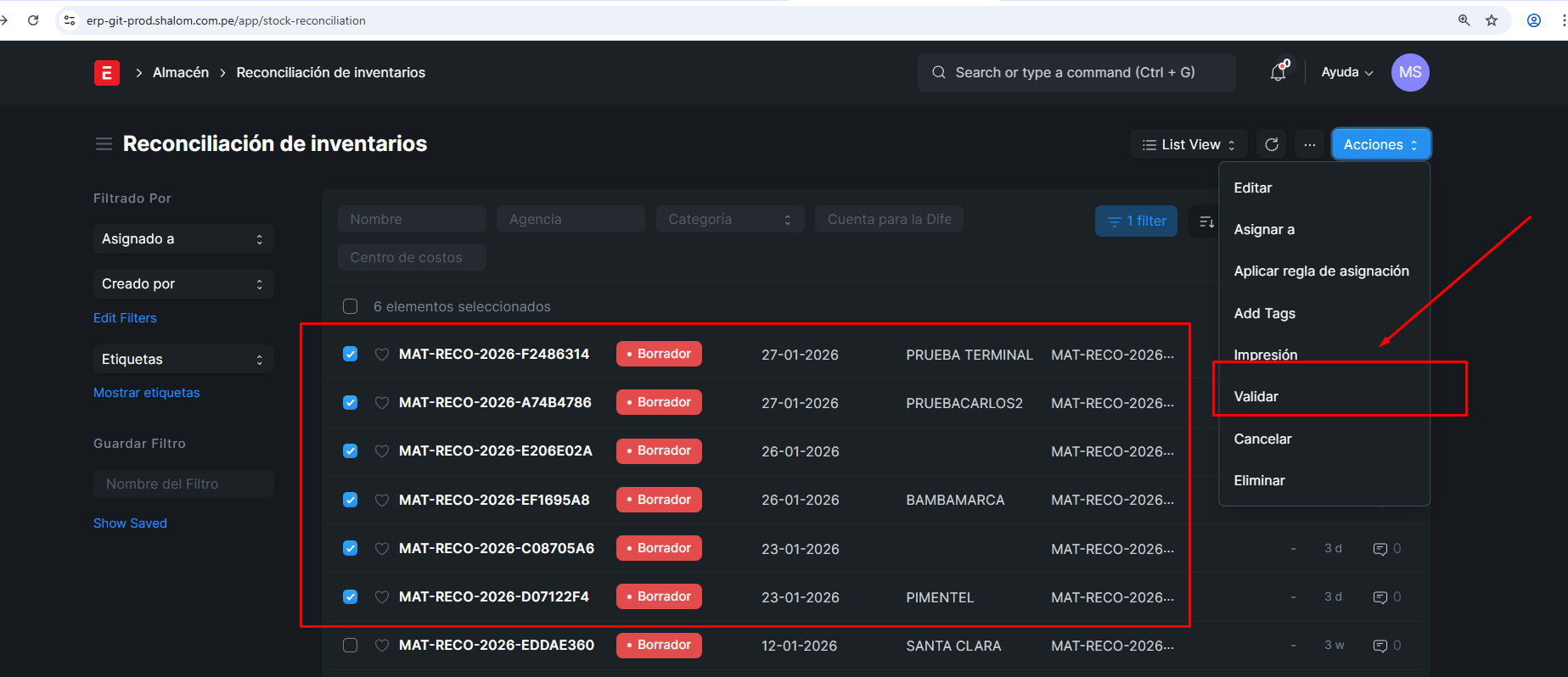 -intentamos una validación masiva seleccionando las casillas e intentamos validar, haciendo esto visualizaremos el mensaje “No se puede generar nuevas series bajo una reconciliación de inventario.”