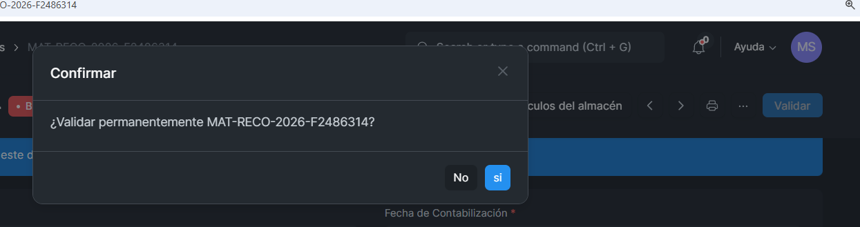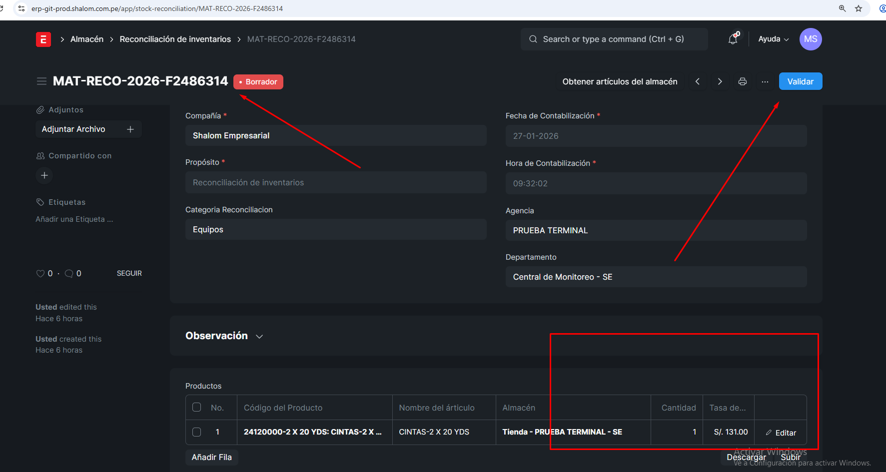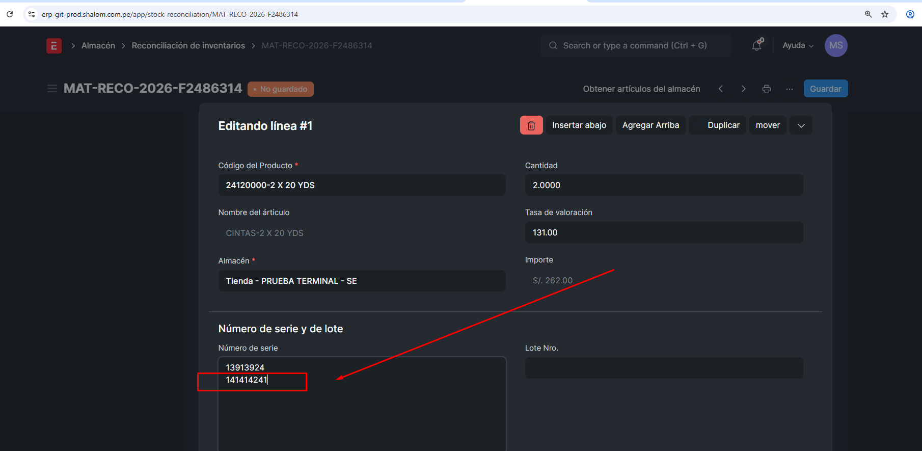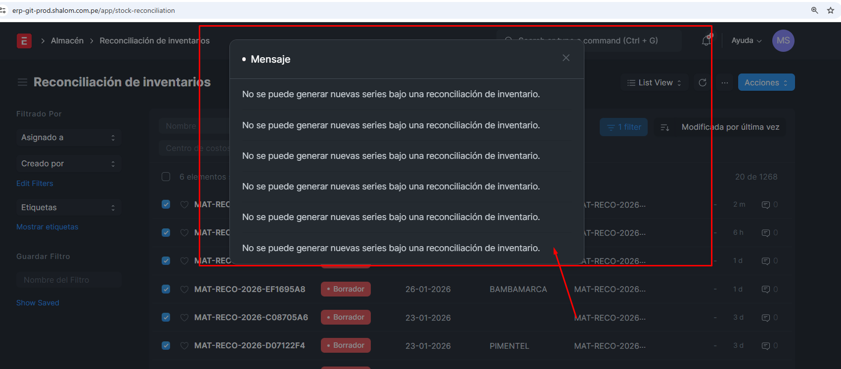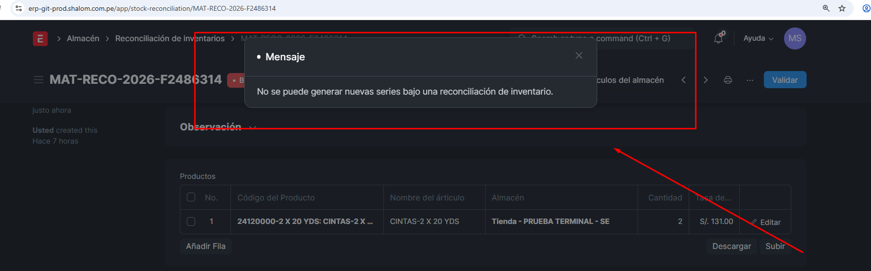 5.3 Al intentar validar nos muestra la alerta: “No se puede generar nuevas series bajo una reconciliación de inventario.”