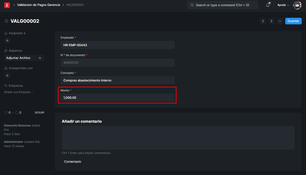 Trazabilidad: Cualquier edición en los campos de validación queda registrada con el nombre del sistema o usuario que realizó el cambio (ej. "Giancarlo Sistemas").