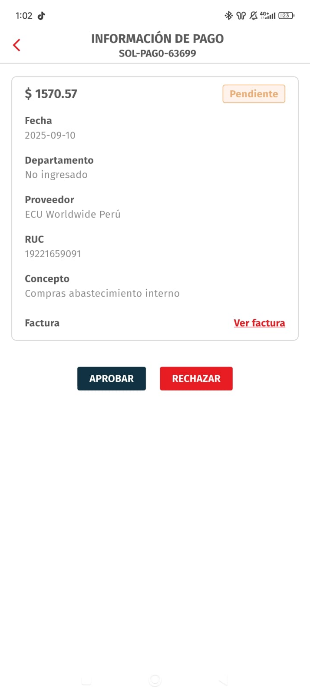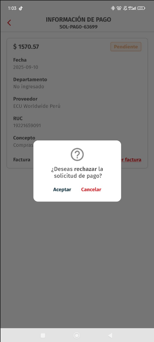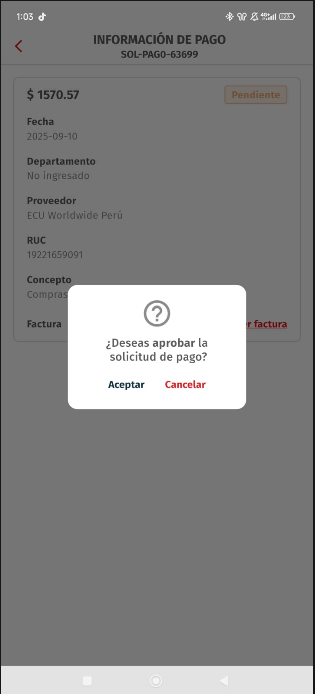 Aprobación: Al presionar el botón de aprobar, aparecerá el mensaje: “¿Deseas aprobar la solicitud de pago?”. Al seleccionar Aceptar, el estado cambia a Validado tanto en el móvil como en el ERP.