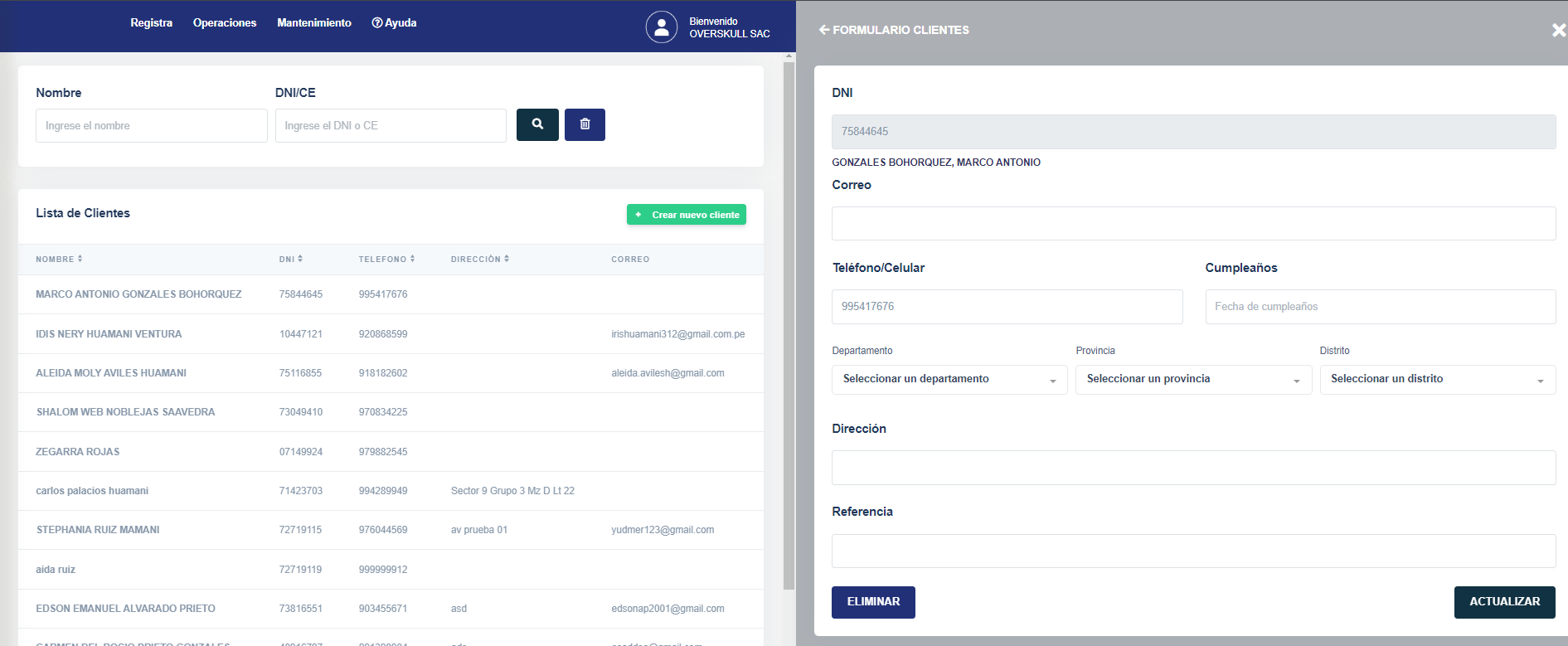 Identificación: El sistema reconoce al usuario como "Bienvenido OVERSKULL SAC".