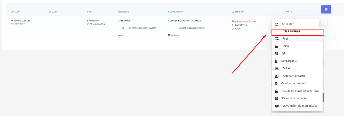 El usuario identifica la guía y selecciona Cambiar tipo de pago.