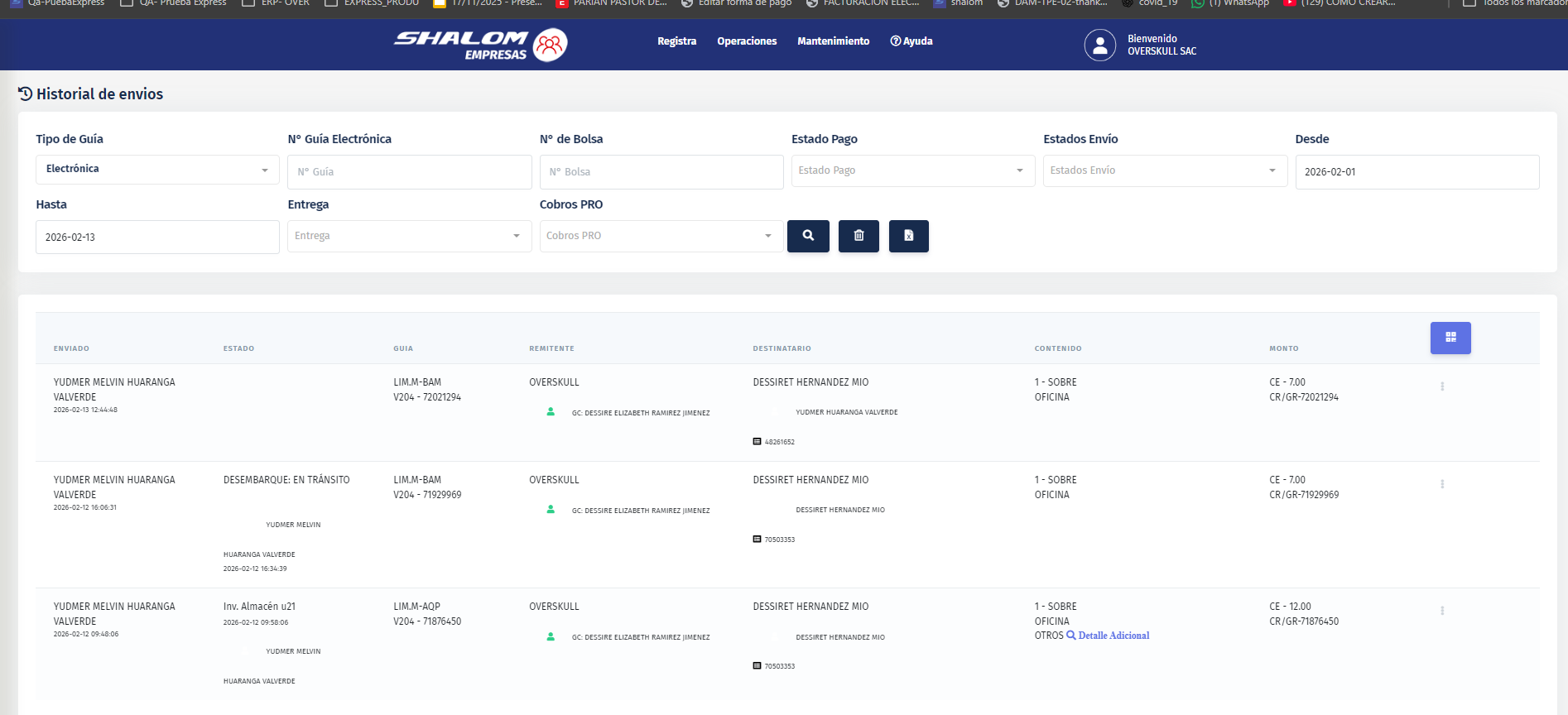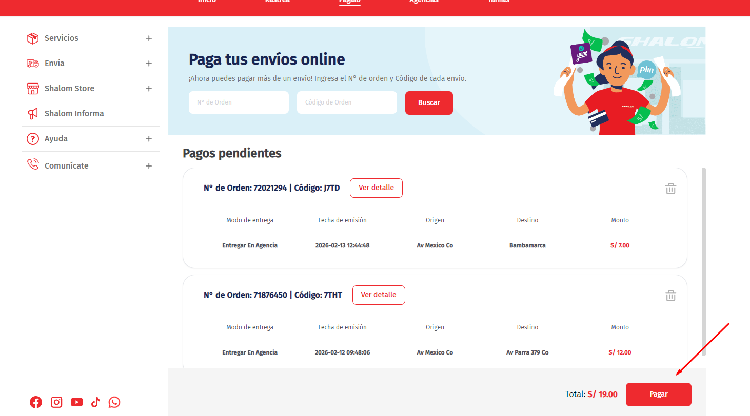 El sistema muestra en la sección inferior las guías pendientes de pago.