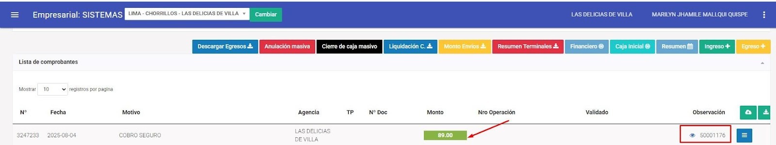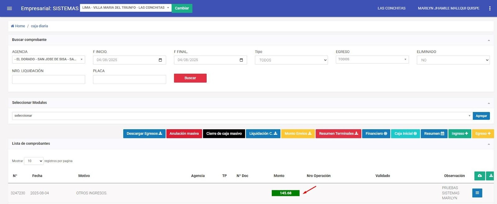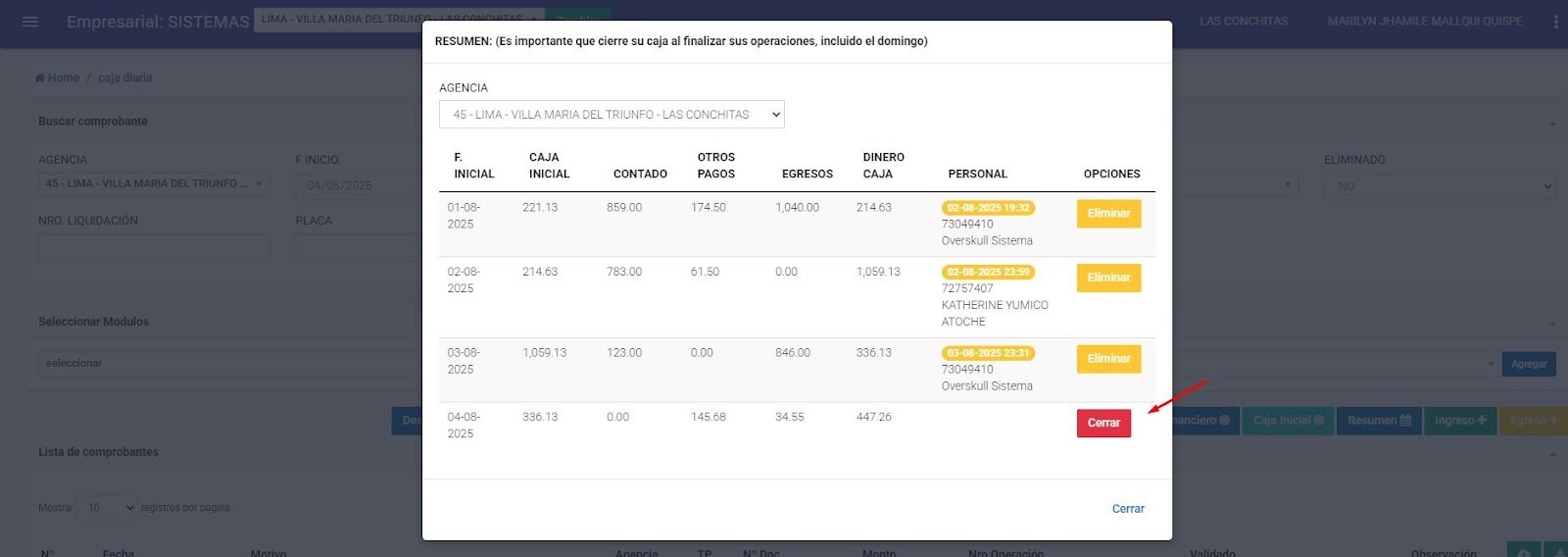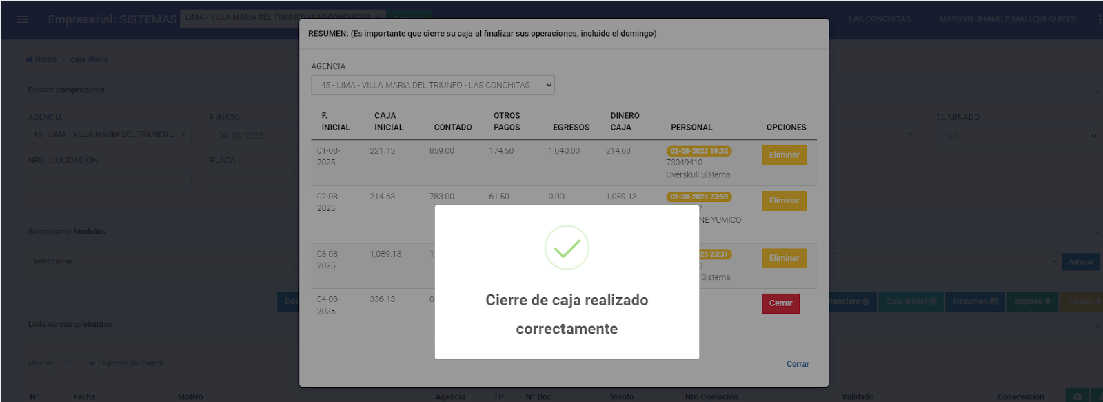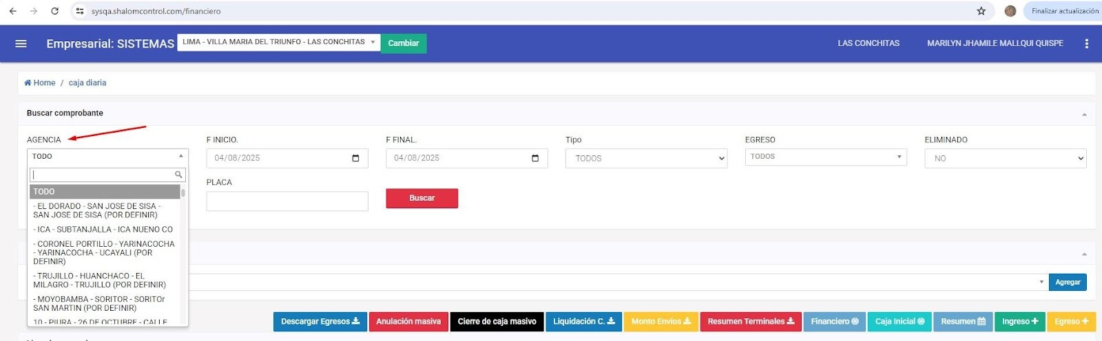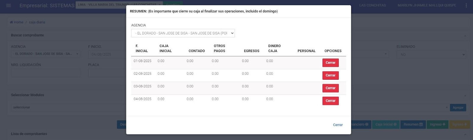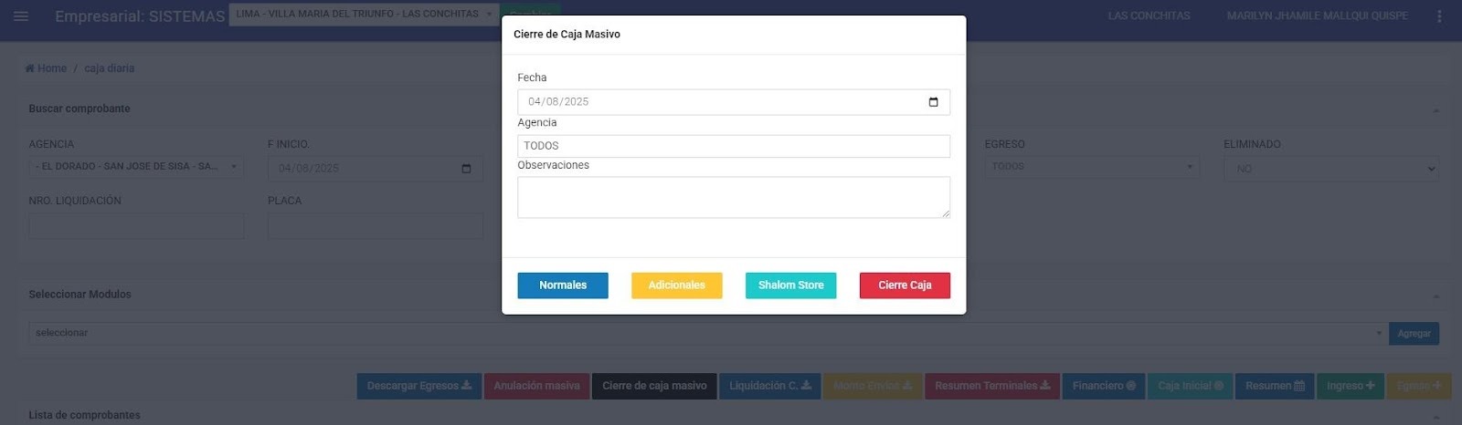 Cierre de caja masivo: Permite realizar el cierre de caja de todas las agencias de forma masiva.