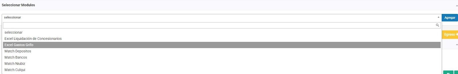 En segunda instancia, en el cuadro de seleccionar módulos, tendremos las siguientes opciones: Excel liquidación de concesionarios, excel gastos grifo, match depósitos, match bancos, match niubiz y match culqui.
