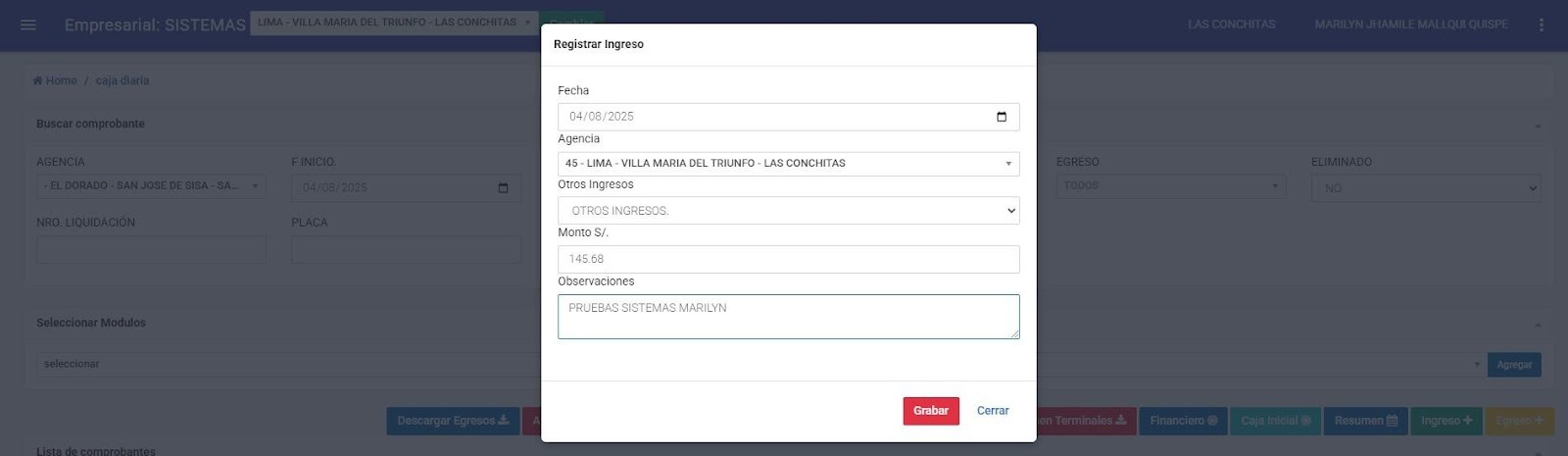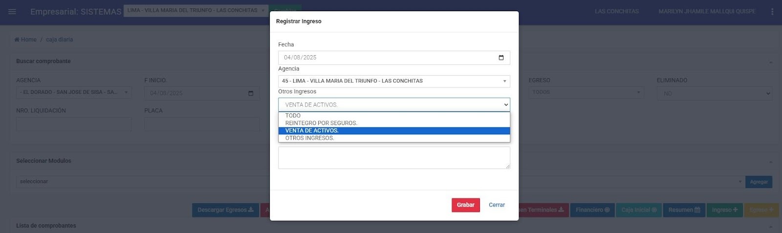 Ingreso: Se puede seleccionar un ingreso con el monto respectivo para guardar la data.