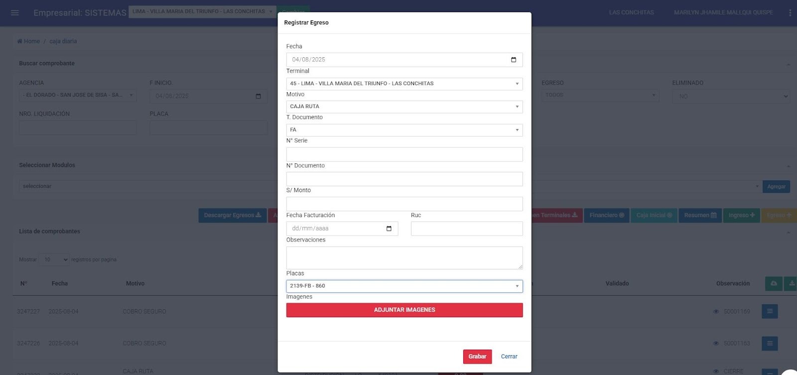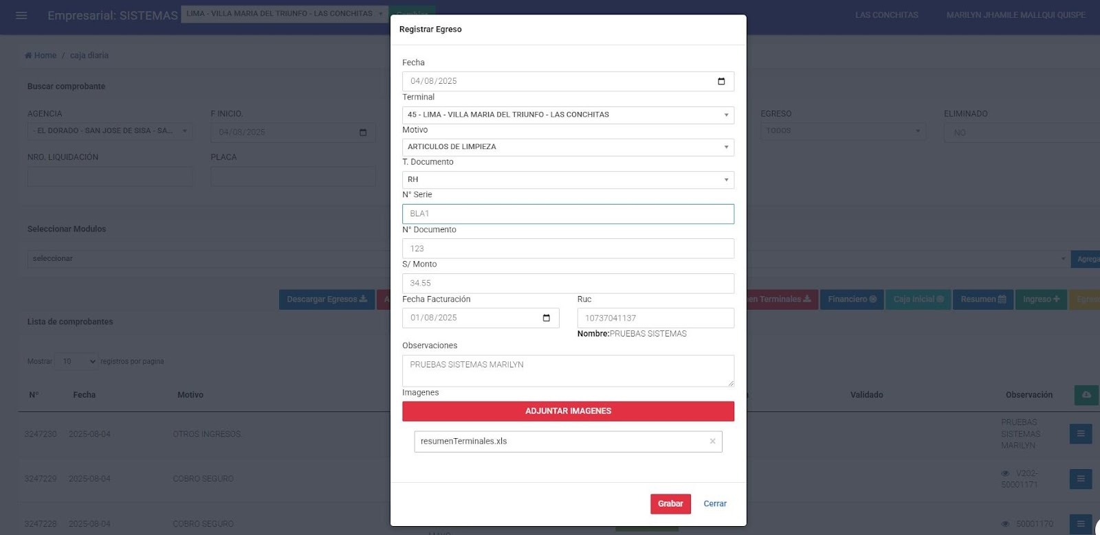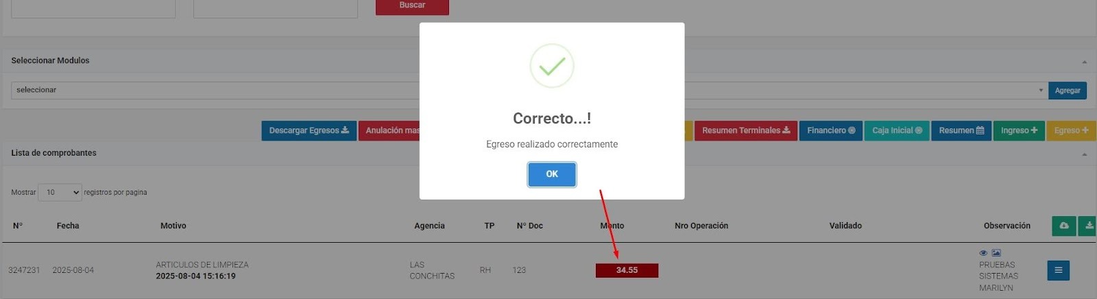 Egreso: Se puede registrar un egreso con las opciones correspondientes.