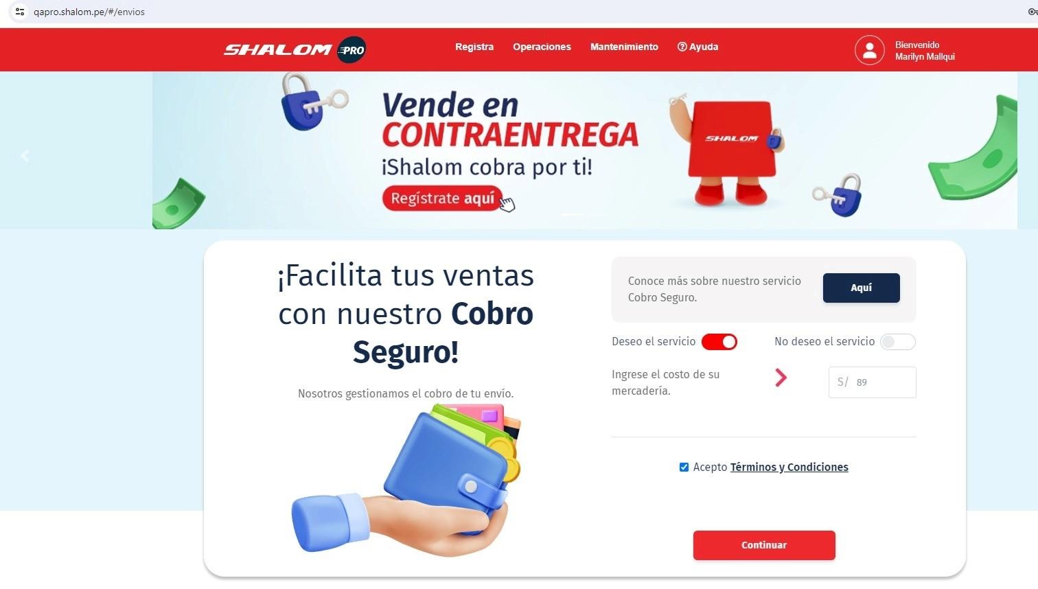 También se podrán realizar ingresos y egresos desde otros módulos, erp o aplicativos según sea el caso. Se hará un ejemplo de un pedido de shalom pro, con cobro seguro.