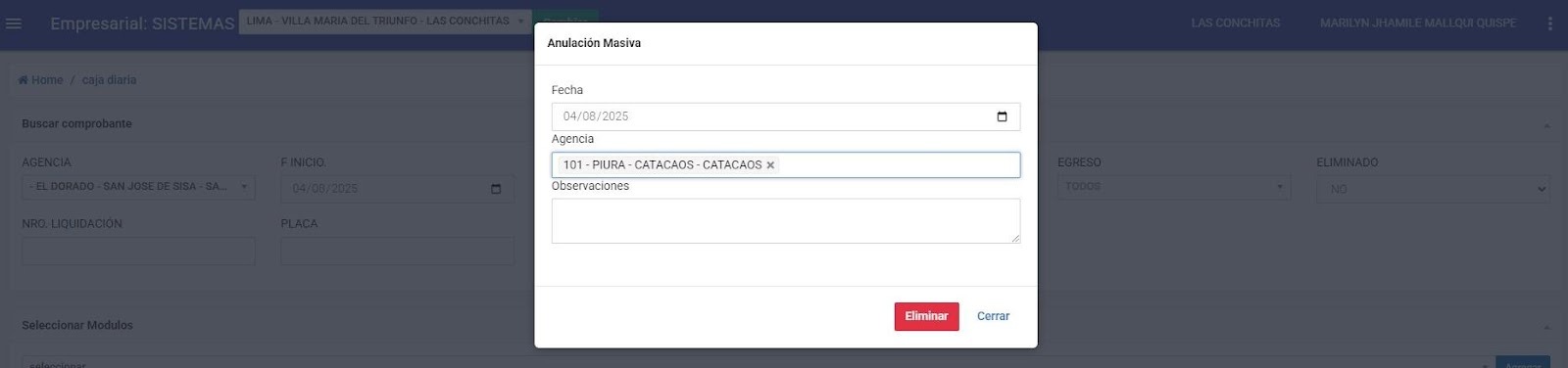 Anulación masiva: Permite anular todos los registros de toda una agencia en particular por fecha.