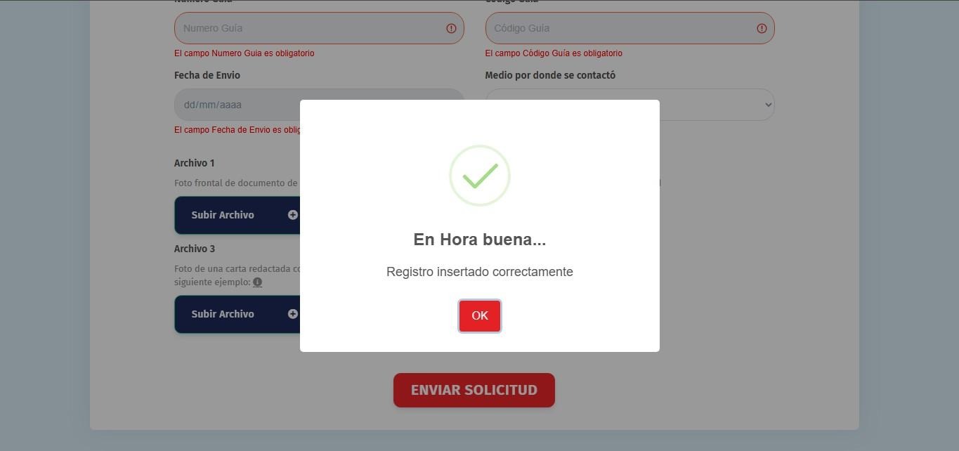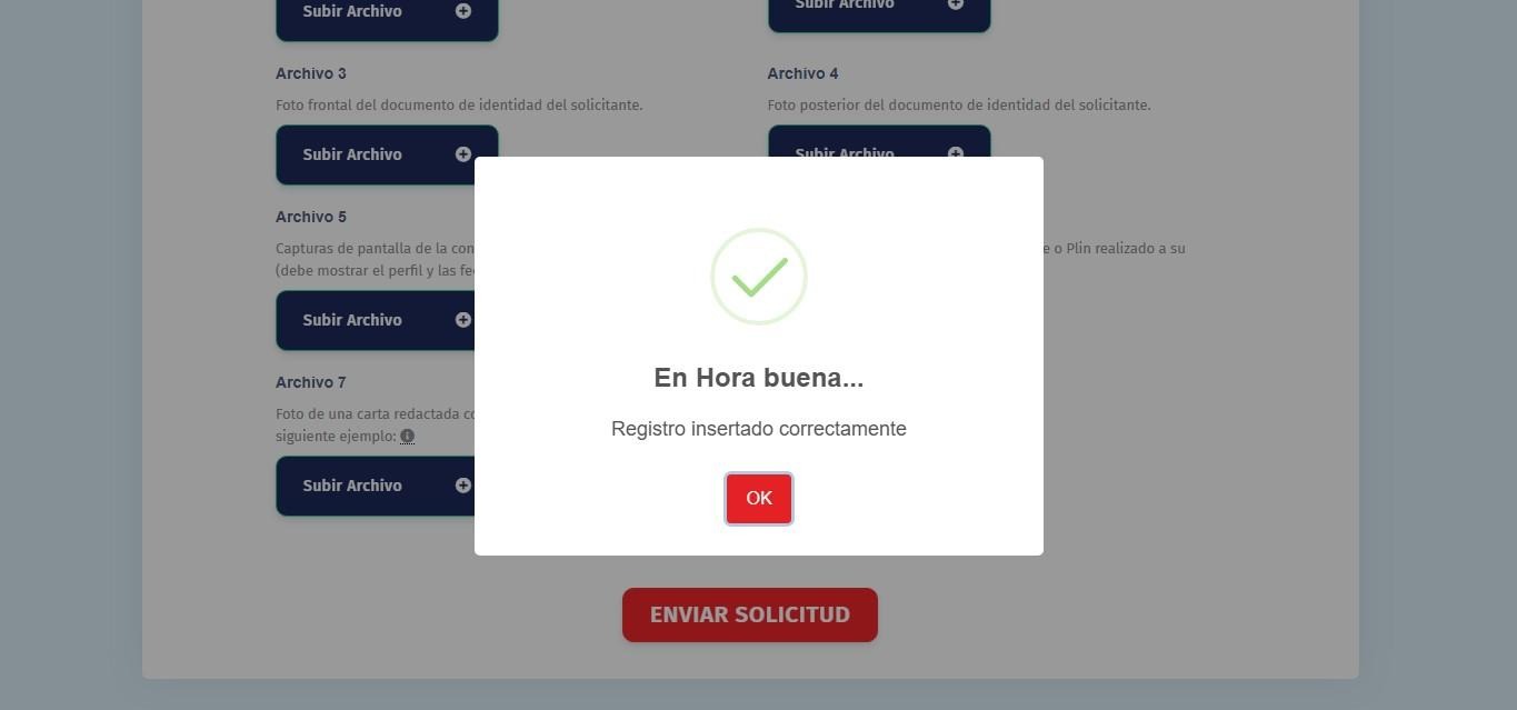 Se nos mostrará un mensaje de confirmación del registro, Con esto, culmina el proceso en el formulario web.