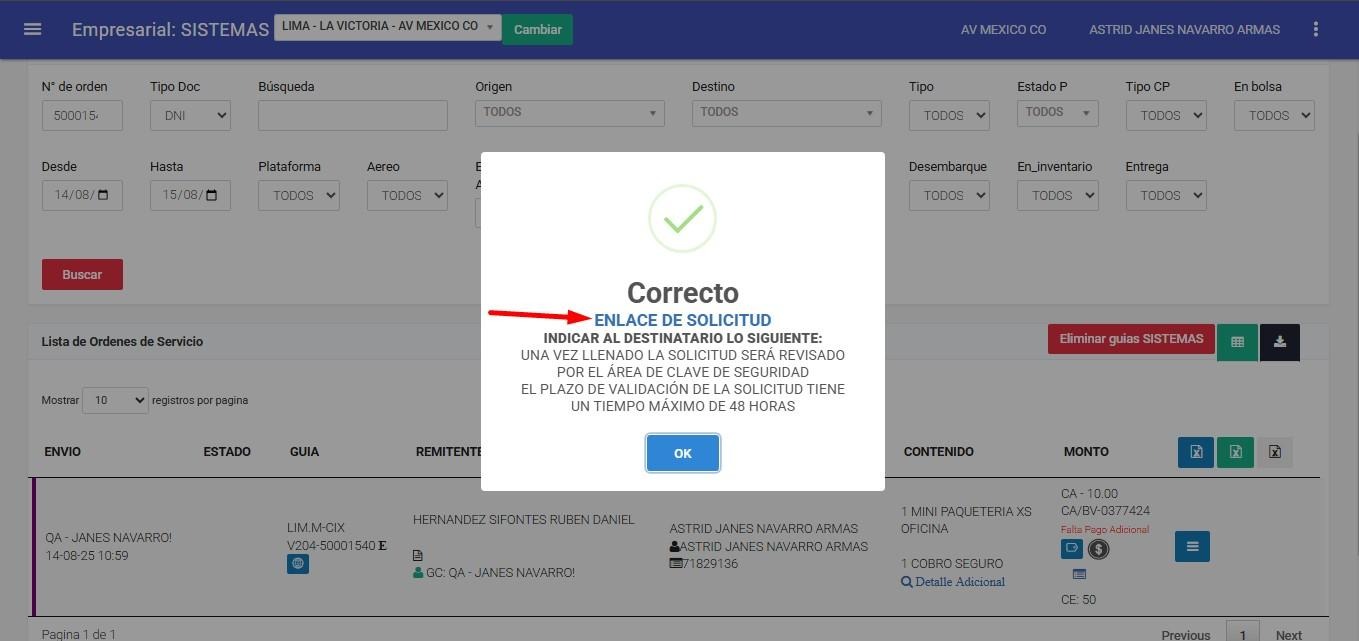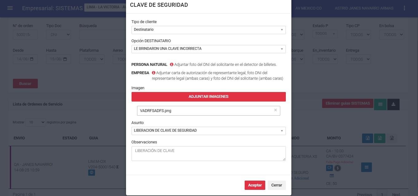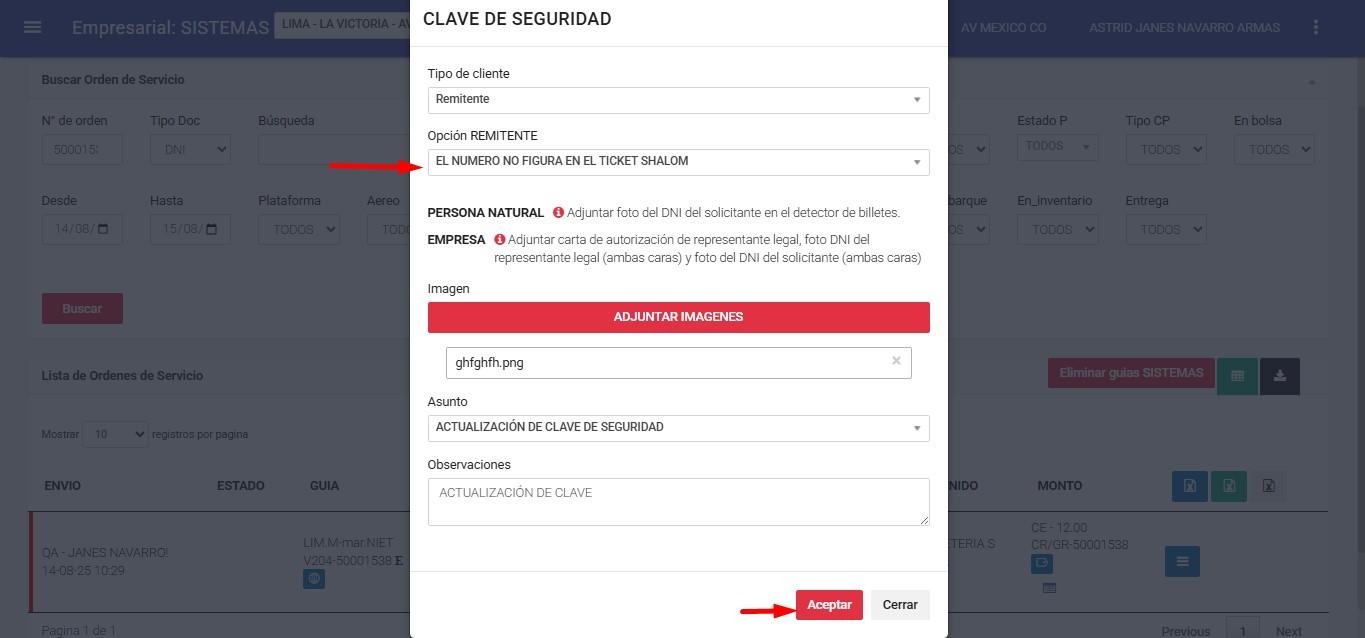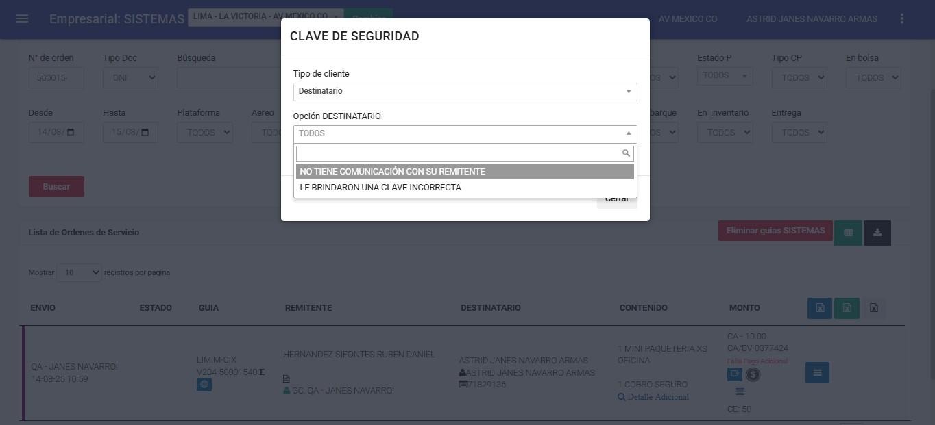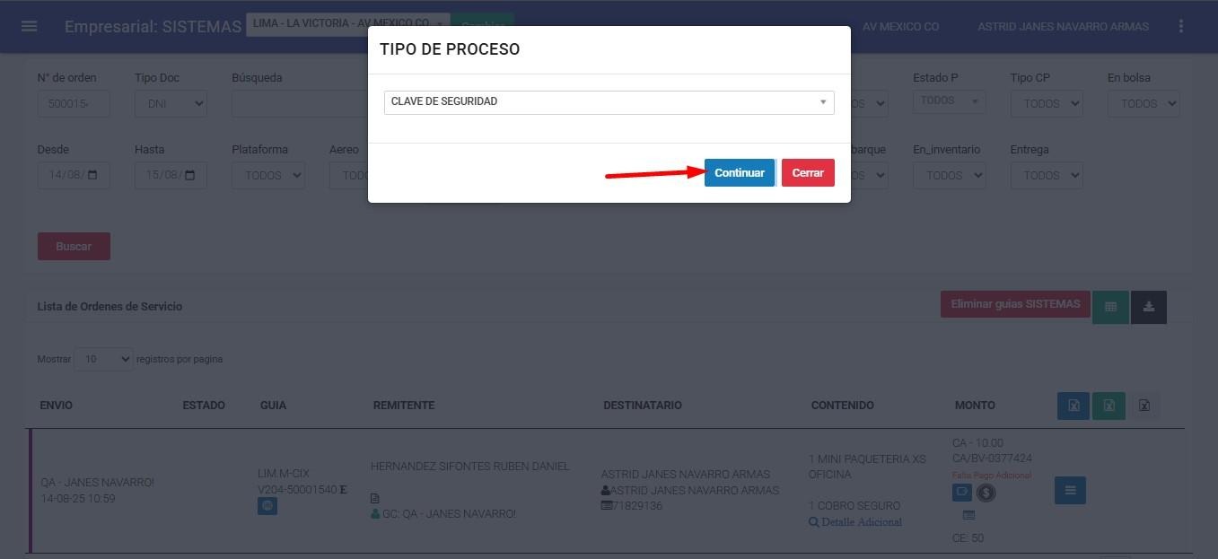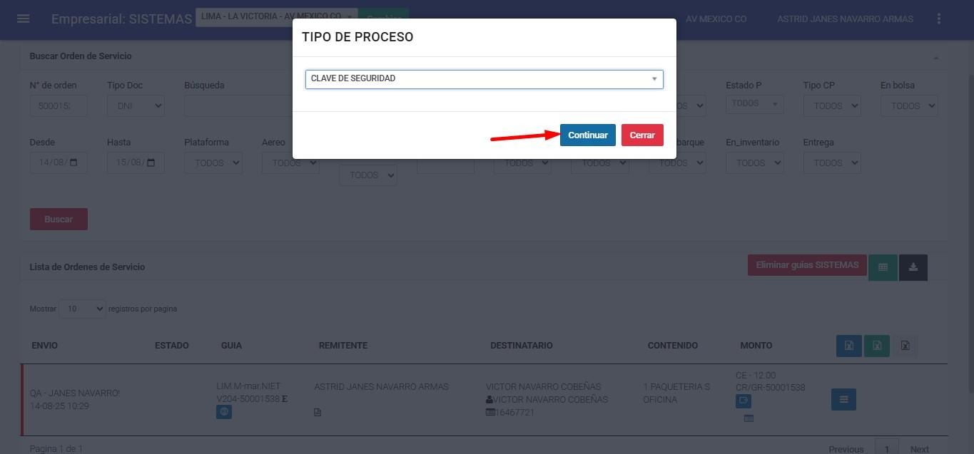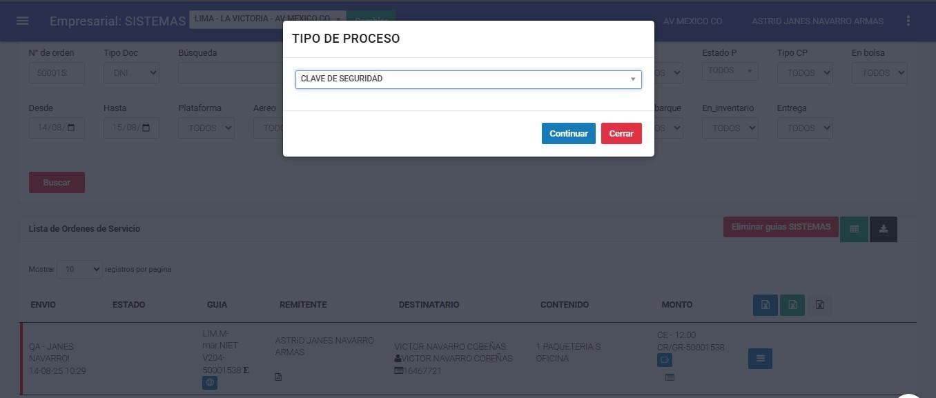● Lista Orden de Servicio => Procesos => Clave de seguridad.