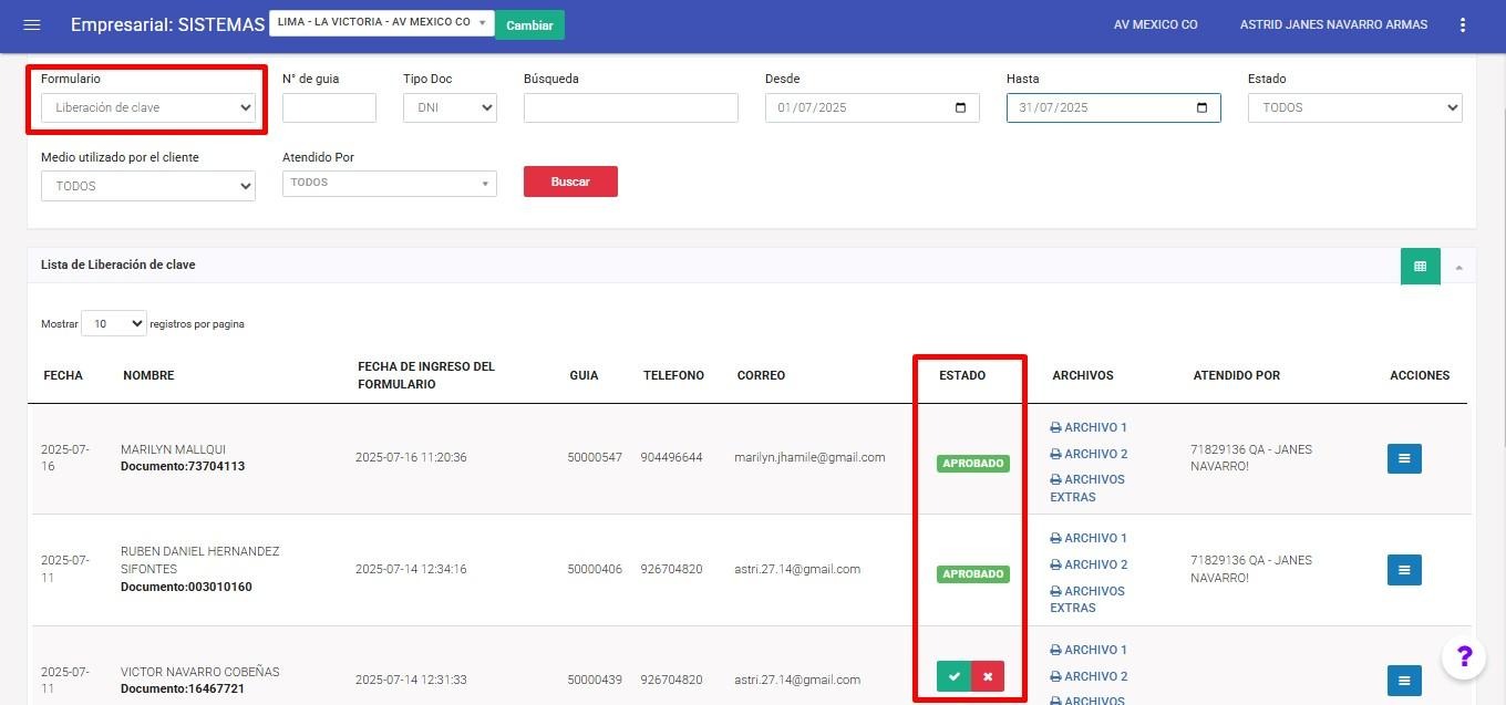 Podremos identificar los formularios en estado pendiente cuando aparezcan con el ícono de check verde y la ‘X’ roja. Esto indica que dichos formularios aún no han sido atendidos.