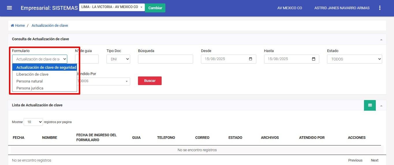 Ingrese al apartado Formularios, donde encontrará el primer filtro que le permitirá seleccionar el tipo de formulario: Actualización de Clave o Liberación de Clave.