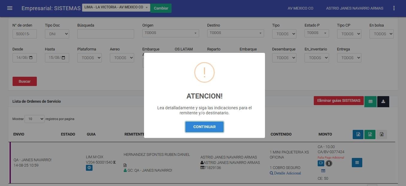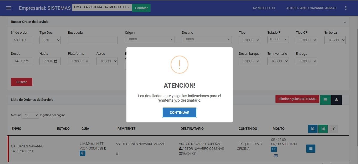 El sistema mostrará un mensaje informativo. Léalo cuidadosamente y, una vez comprendido, haga clic en Continuar para avanzar al siguiente paso.