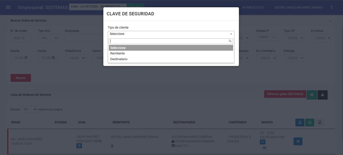 A continuación, se mostrará un modal donde se deberá seleccionar el tipo de cliente. En este caso, se elegirá al remitente, ya que la actualización de clave únicamente puede ser realizada por el remitente.