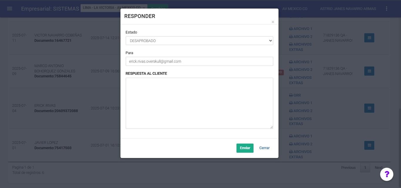 Se abrirá el modal de respuesta para el cliente, donde se detalla el estado de su solicitud. De manera automática, se mostrará el correo del cliente, mientras que el campo Respuesta al cliente deberá ser completado manualmente.