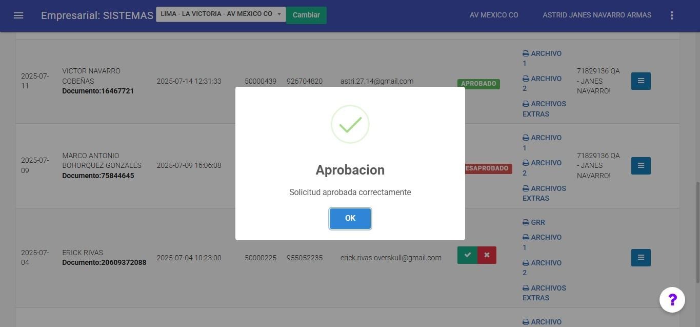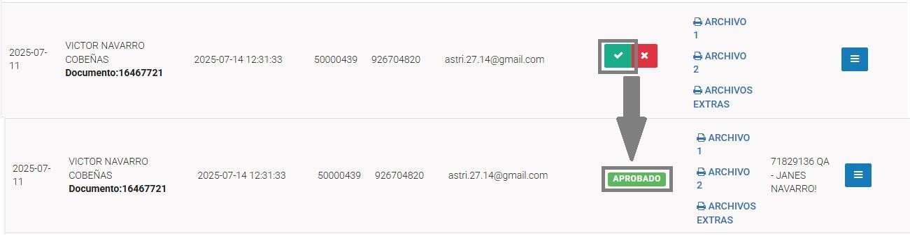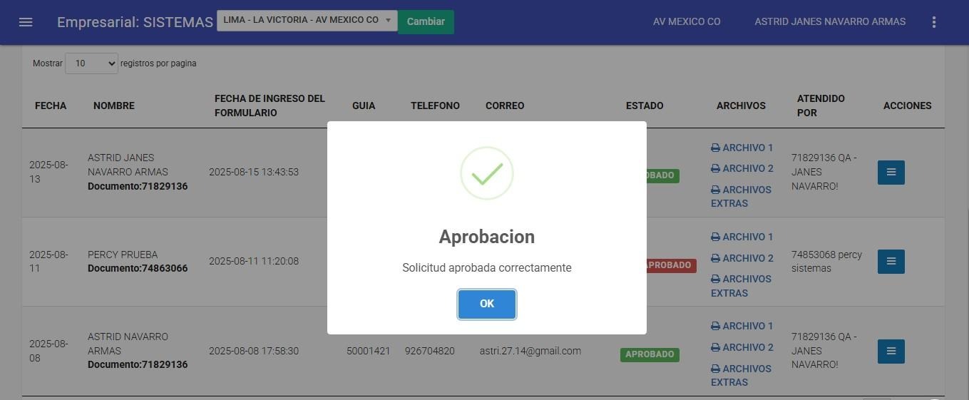Para que un formulario pase al estado aprobado, se deberá marcar manualmente el check verde. Al hacerlo, el sistema mostrará un mensaje de confirmación de la acción realizada.