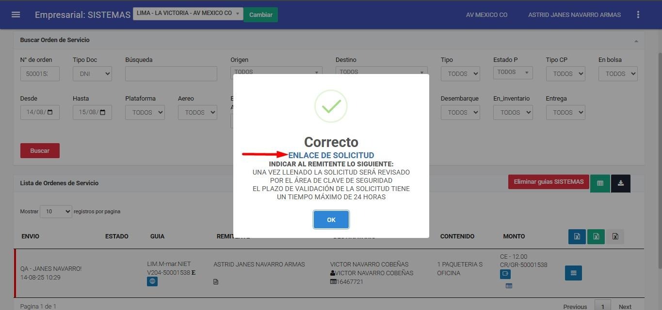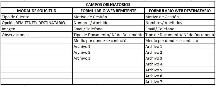 Una vez seleccionada la opción Remitente, se mostrará el modal de solicitud. Es indispensable completar todos los campos, ya que son obligatorios para continuar con el proceso.