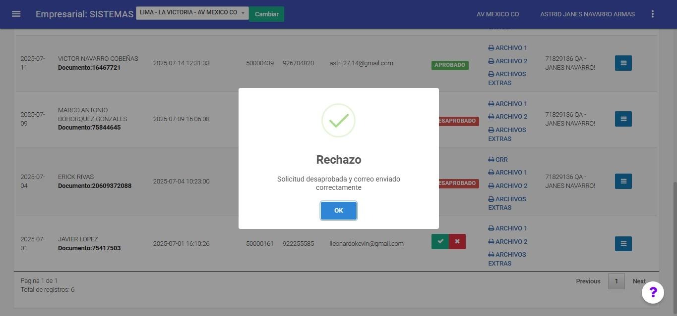 Para que un formulario pase al estado desaprobado, se deberá marcar manualmente el la x en color rojo. Al hacerlo, el sistema mostrará un mensaje de confirmación de la acción realizada. Posteriormente, el estado del formulario se actualizará a desaprobado.