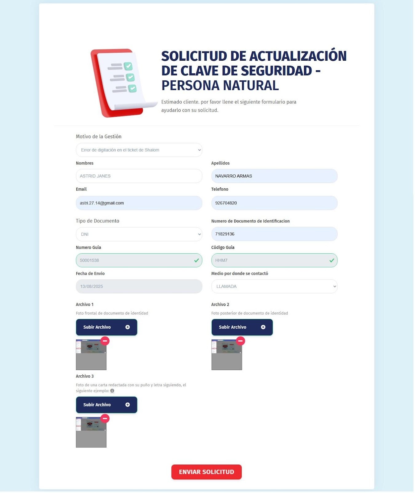 Al hacer clic en el enlace, se abrirá el formulario web de actualización de clave. Es indispensable completar todos los campos obligatorios. Una vez finalizado, haga clic en ‘Enviar Solicitud’.