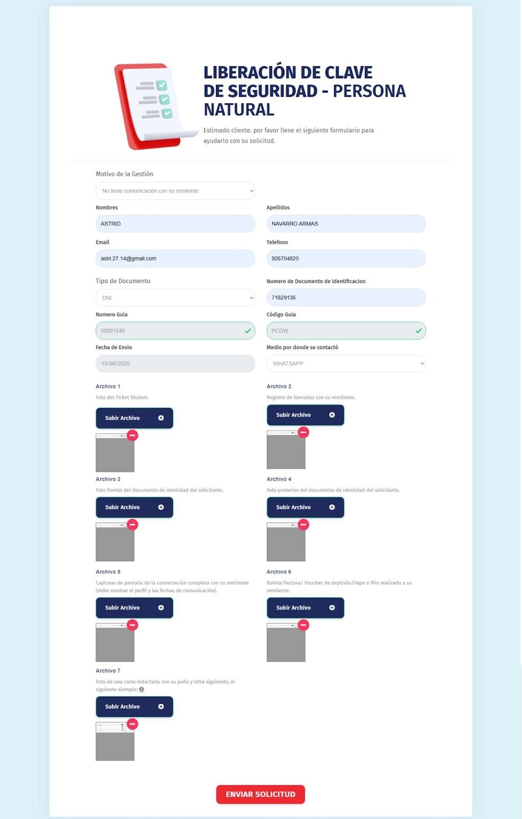 Culminamos el llenado de lo solicitado y pulsamos enviar.