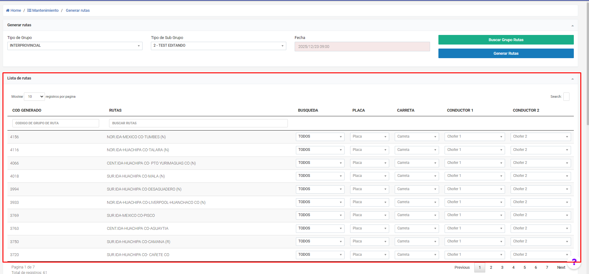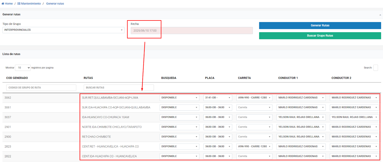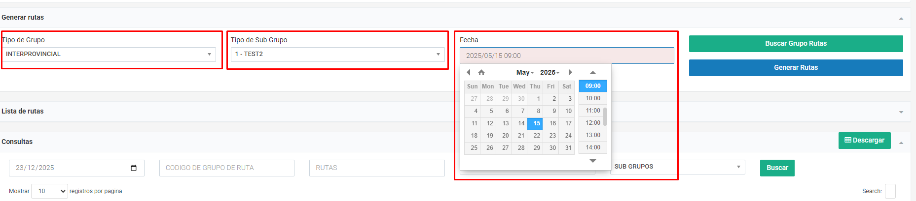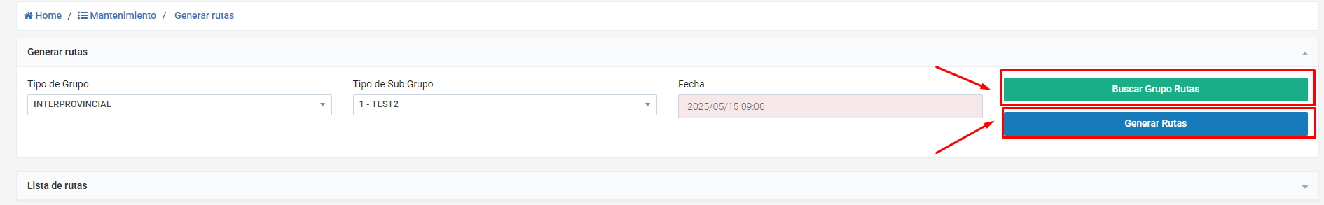 Buscar Grupos Rutas: Busca los grupos de rutas ya creadas en base al select “Tipo de Grupo” y el filtro de fecha.