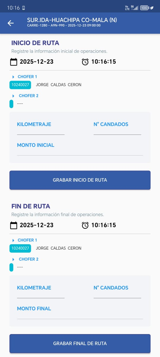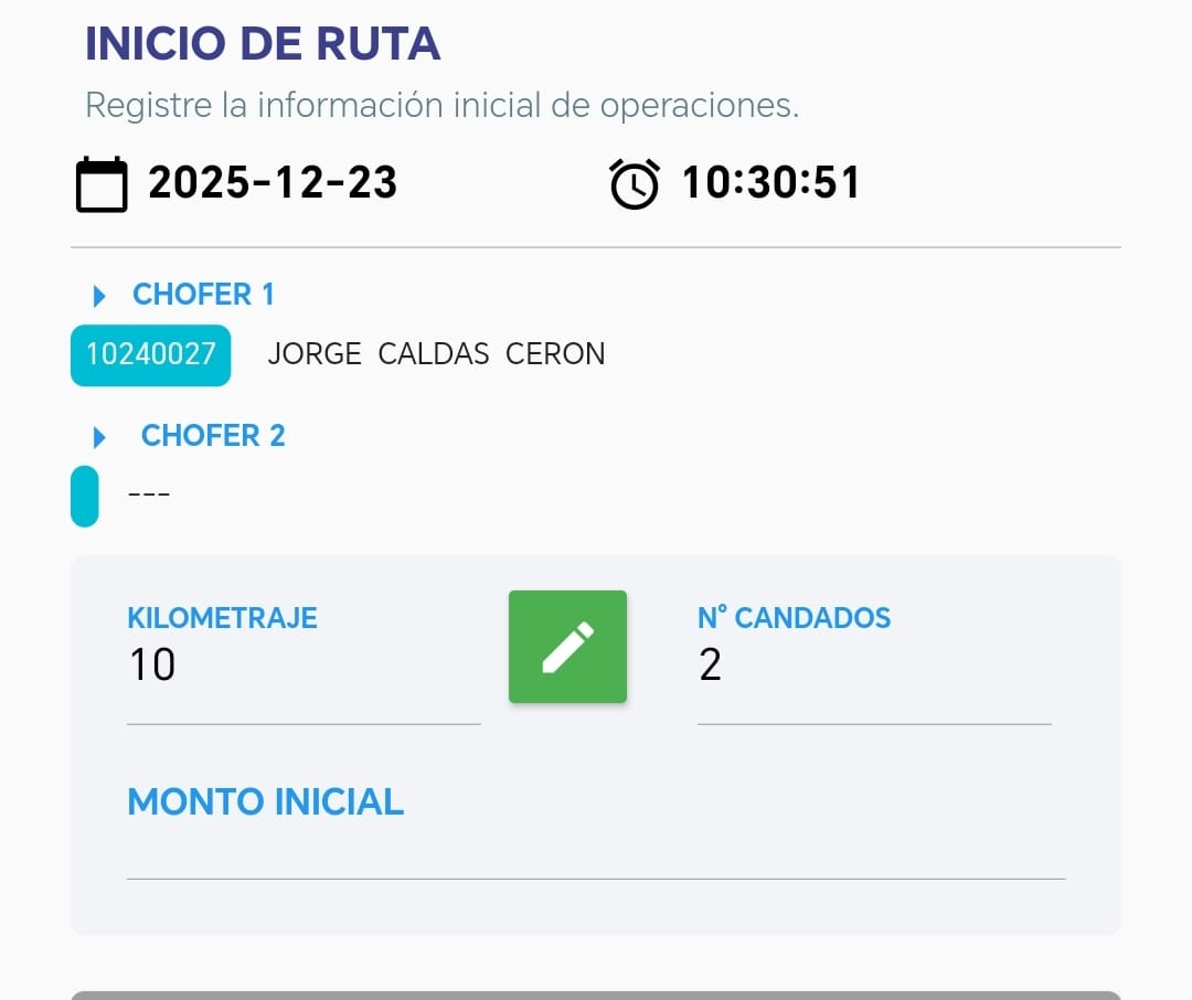 Cuando aceptamos, se nos mostrará la siguiente vista, de Inicio de Ruta donde se nos mostrara la fecha, hora, el chofer