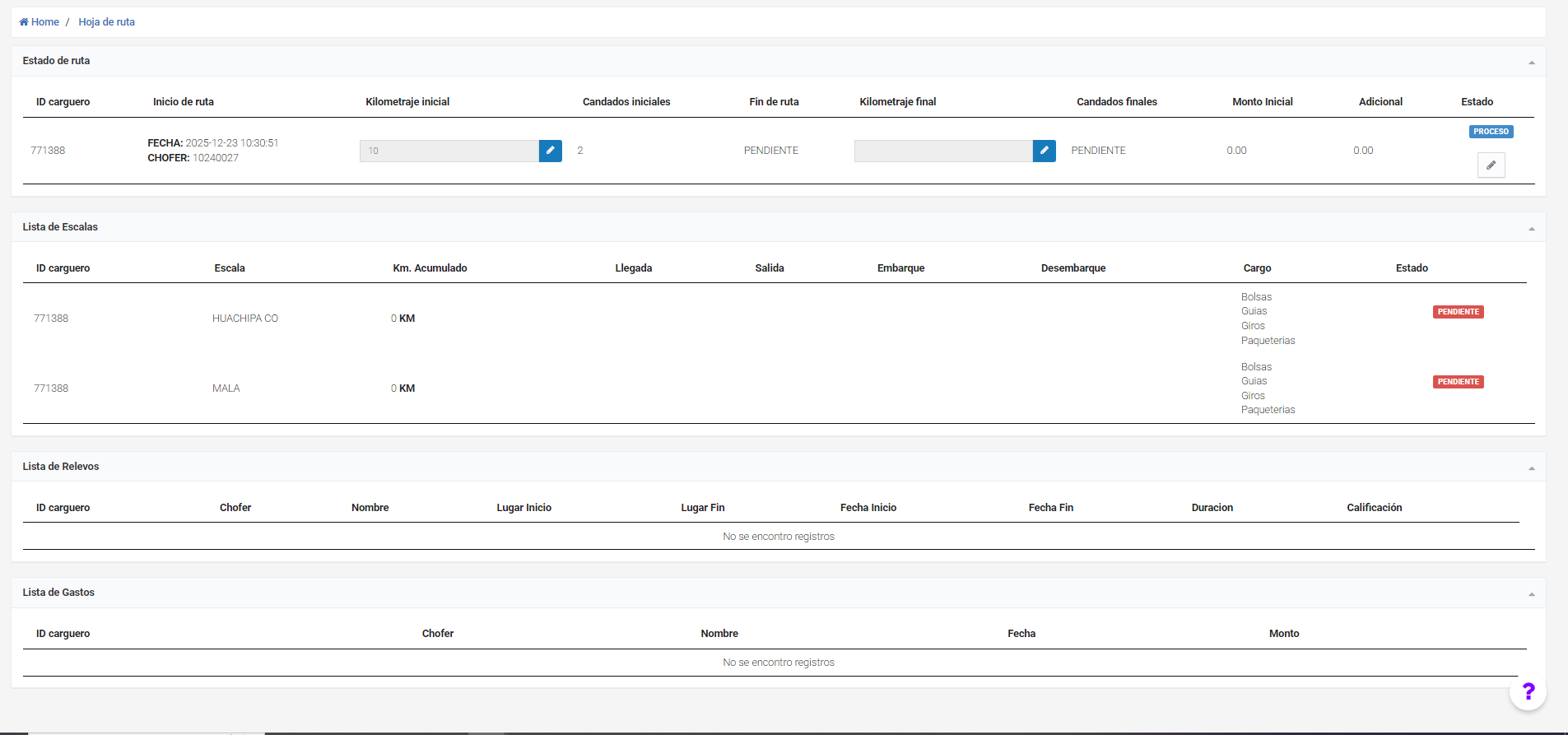 pendiente: El chofer tiene rutas asignadas pero no las ha iniciado todavía.
