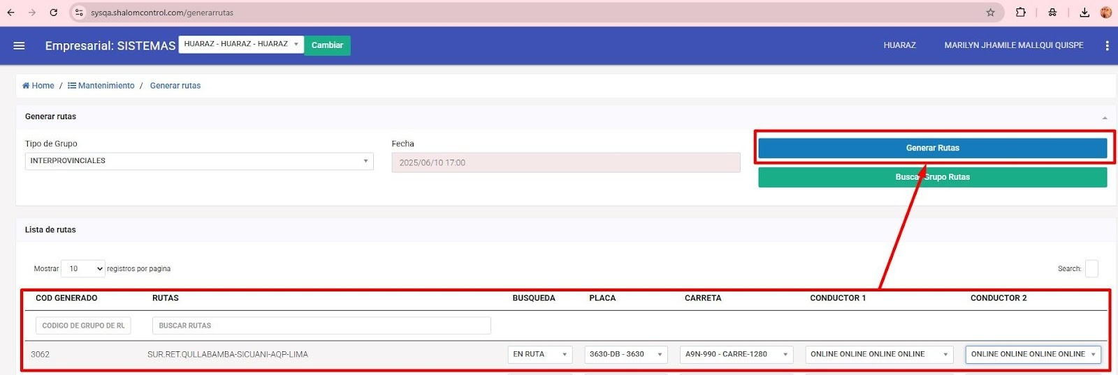 Esto hará que en el apartado "Lista de rutas" nos muestre las rutas correspondientes a la información solicitada en el apartado "Generar Rutas"