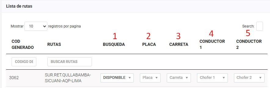 Con los siguientes campos obligatorios: 1. Búsqueda, 2. Placa, 3. Carreta, 4. Conductor 1, el CONDUCTOR 2 es opcional