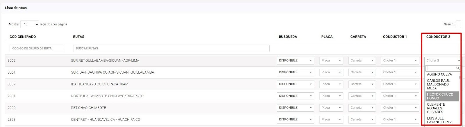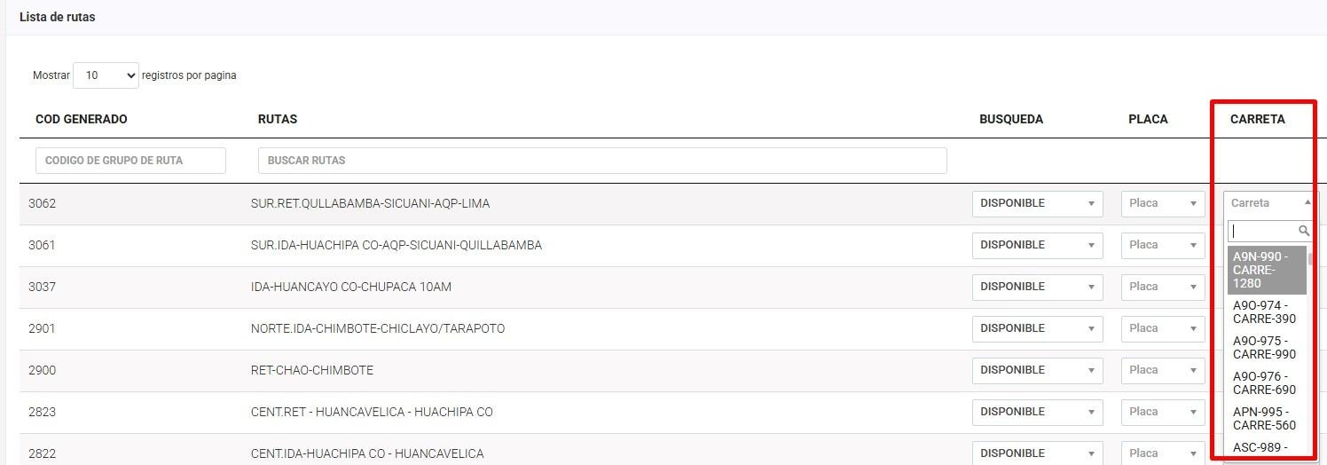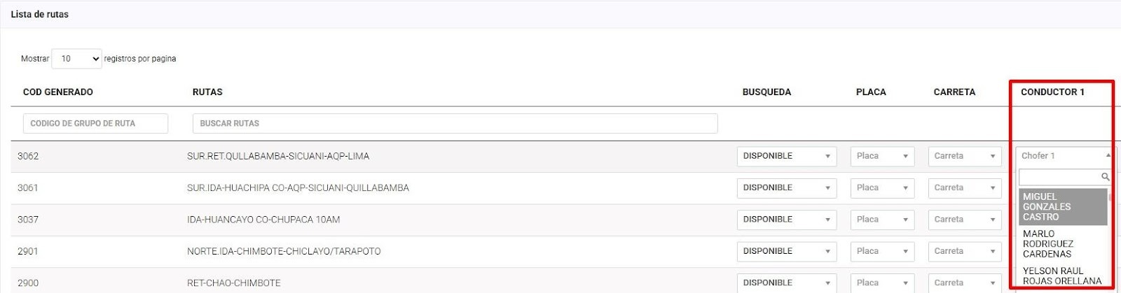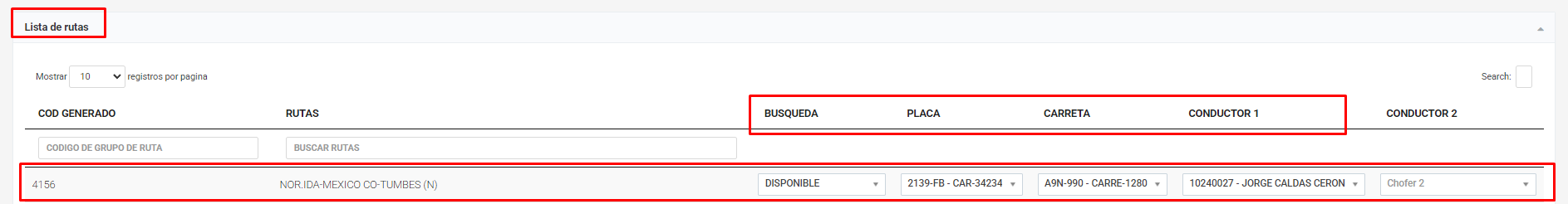 Campos obligatorios: Búsqueda, Placa, Carreta, Conductor 1