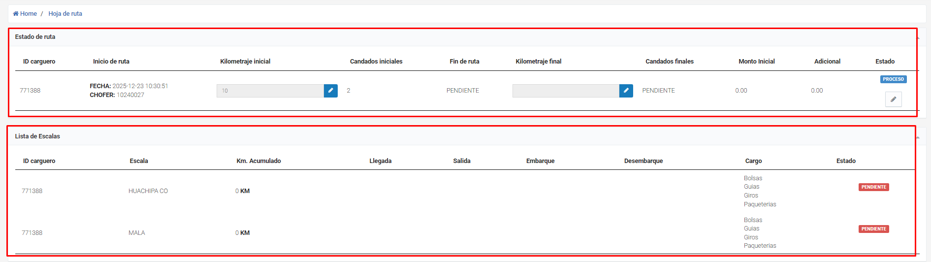○ Lo podemos visualizar en Mantenimiento => Programación de rutas de carguero.