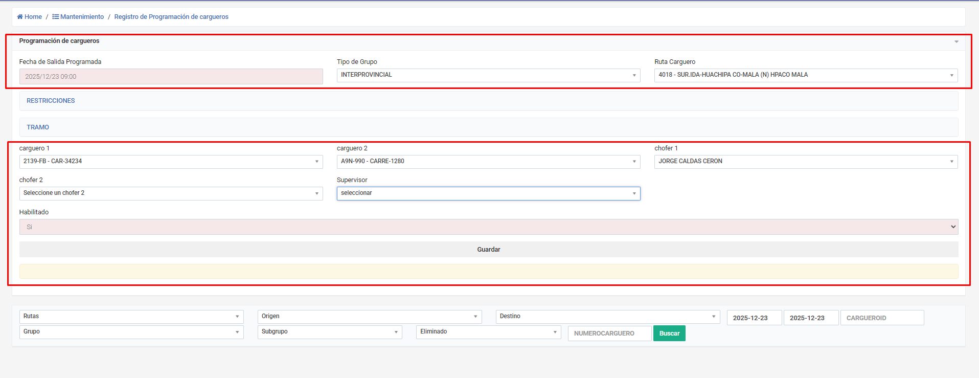 Menú / Mantenimiento / Registro de programación de cargueros