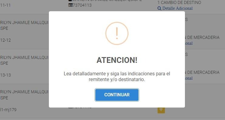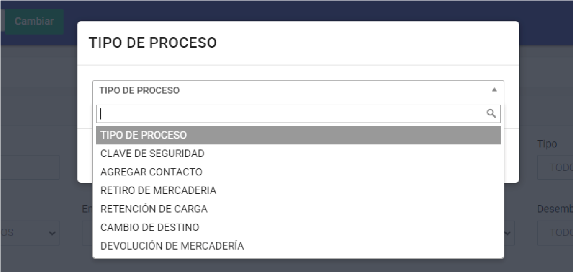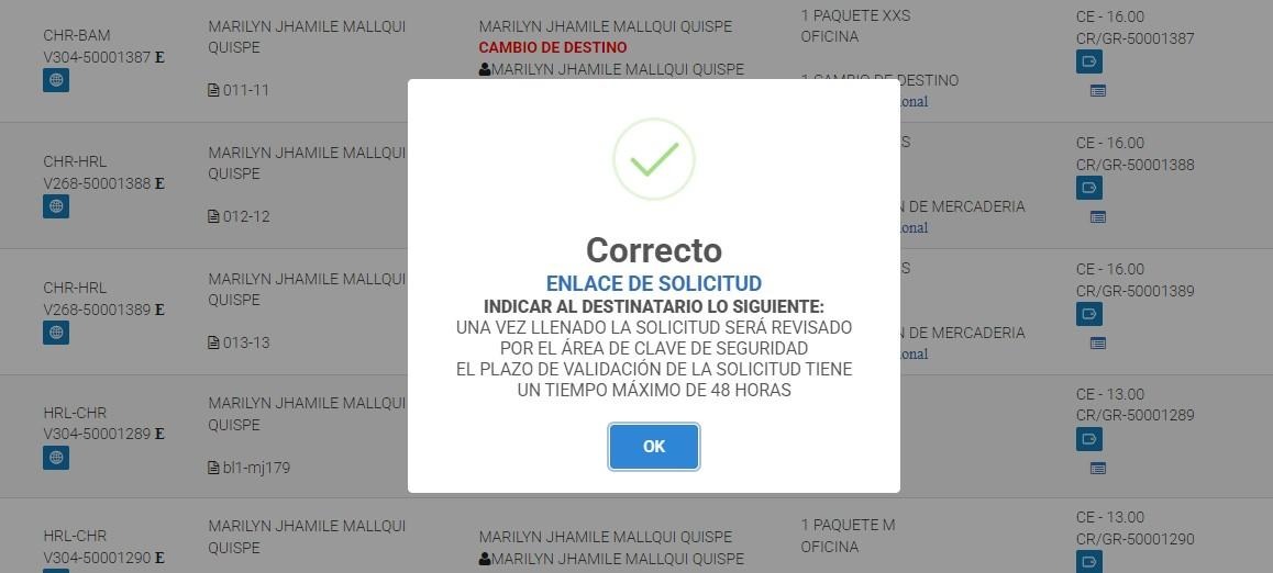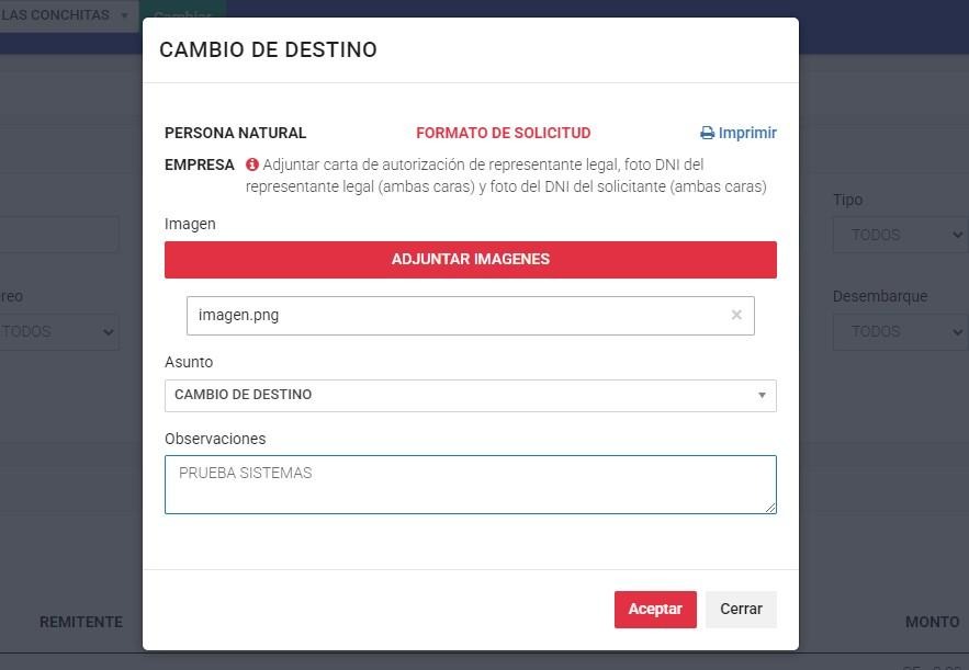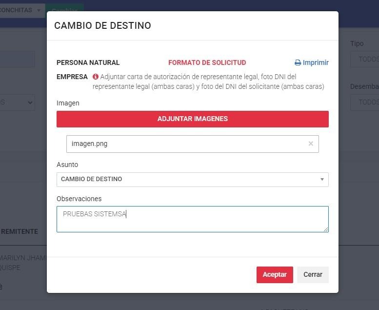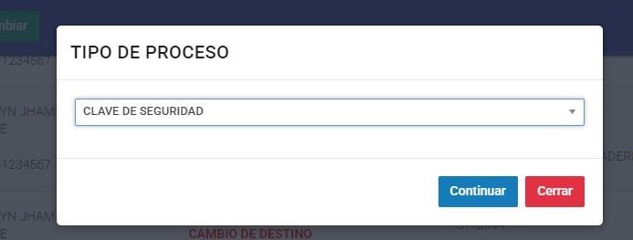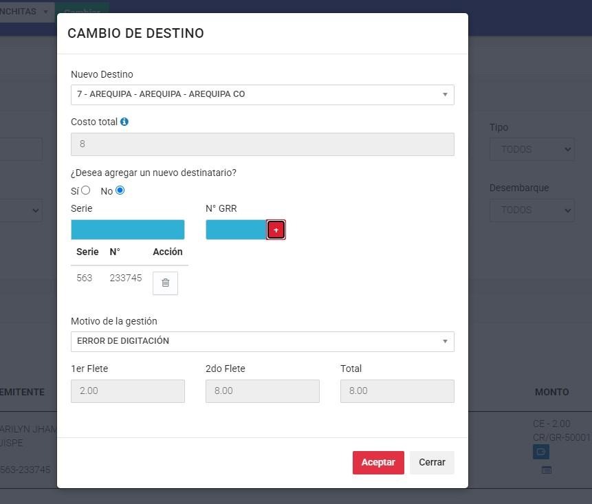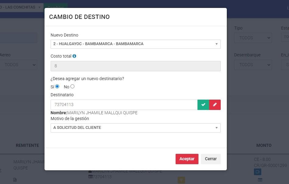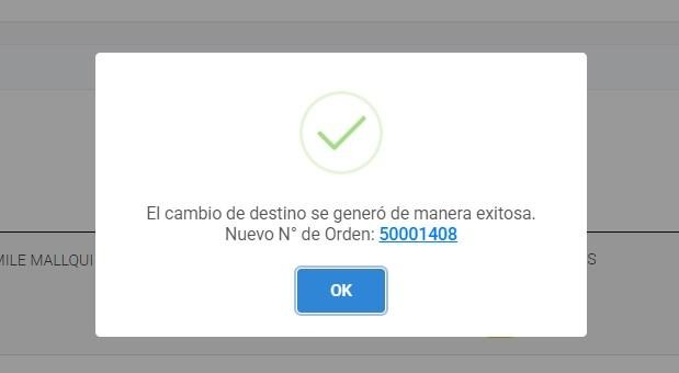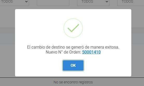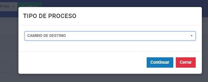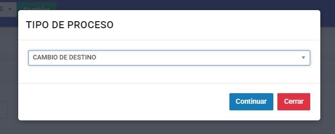 Se visualiza lo siguiente cuando se realiza un proceso de cambio de destino.