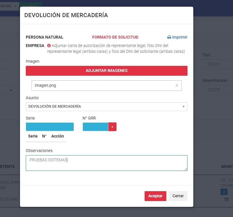 Seleccionamos el nuevo destino y en este caso nos pedirá agregar una serie y grr previamente creada con la guía.