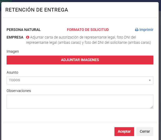 Pulsamos la opción y se nos mostrará el modal de solicitud. NOTA:
