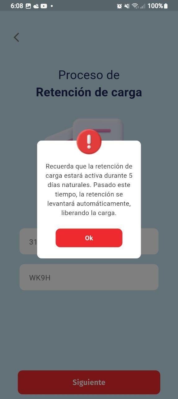 La retención de carga se mantiene activa durante 5 días naturales, Pasado este tiempo, la retención se levanta automáticamente, liberando la carga.