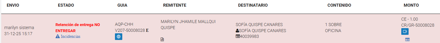 Estado o acción mediante la cual un envío es detenido temporalmente antes de su entrega al destinatario, debido a observaciones, validaciones pendientes, restricciones administrativas, documentarias, de pago o de seguridad, hasta que se cumplan las condiciones necesarias para su liberación.Liberación de entrega: