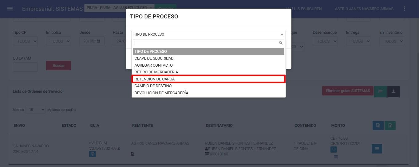 Ingresamos a la sección PROCESOS y encontraremos un sub menú de opciones, dentro ello se encuentra RETENCIÓN DE CARGA.