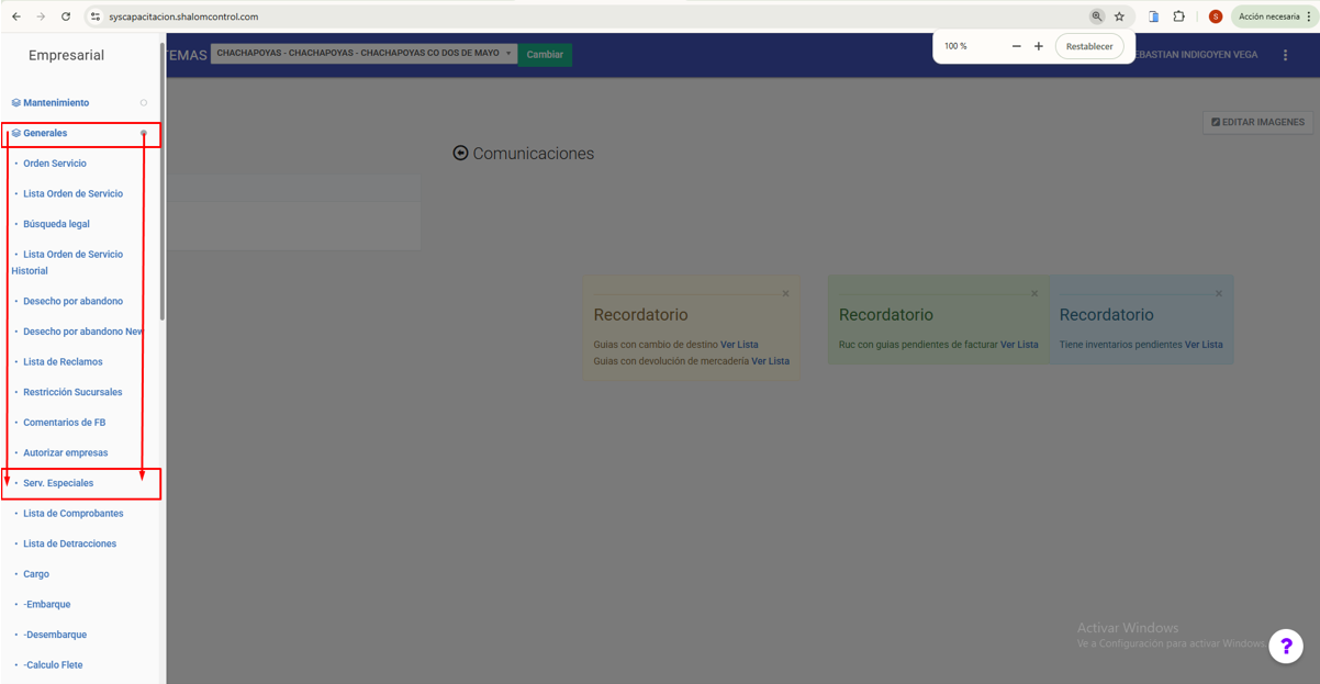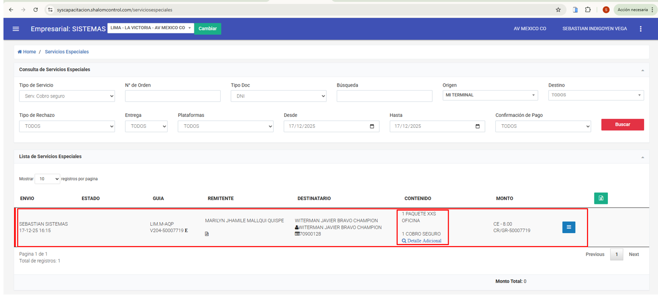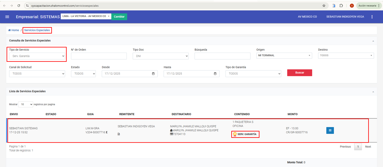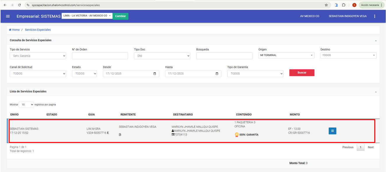 Visualizamos que el registro en el apartado de “Servicios Especiales” y vemos el registro