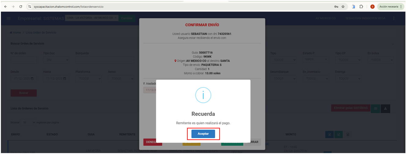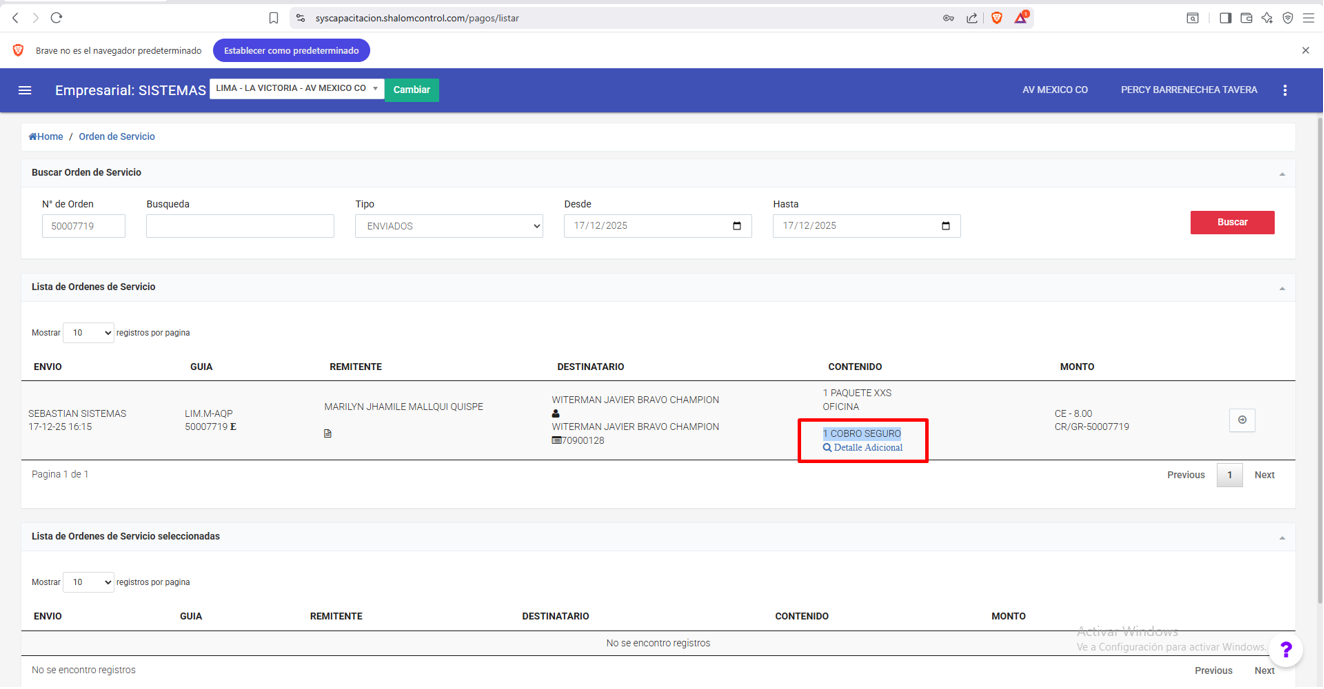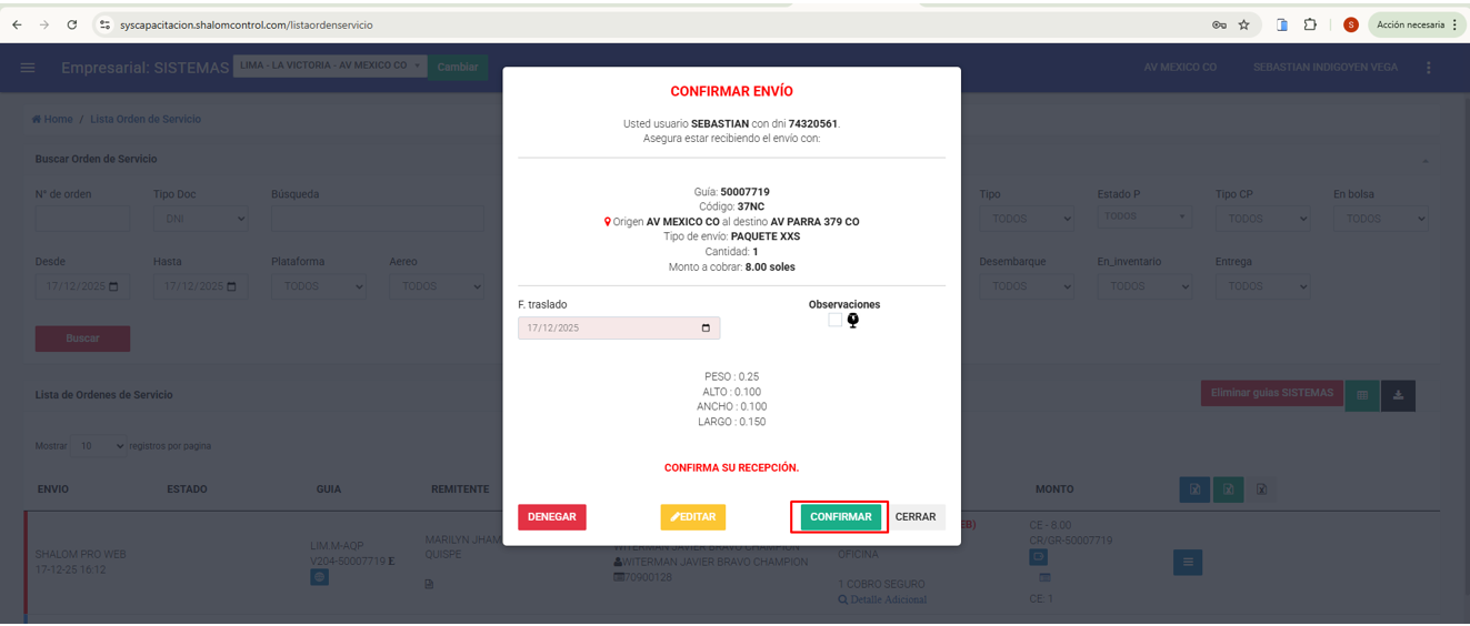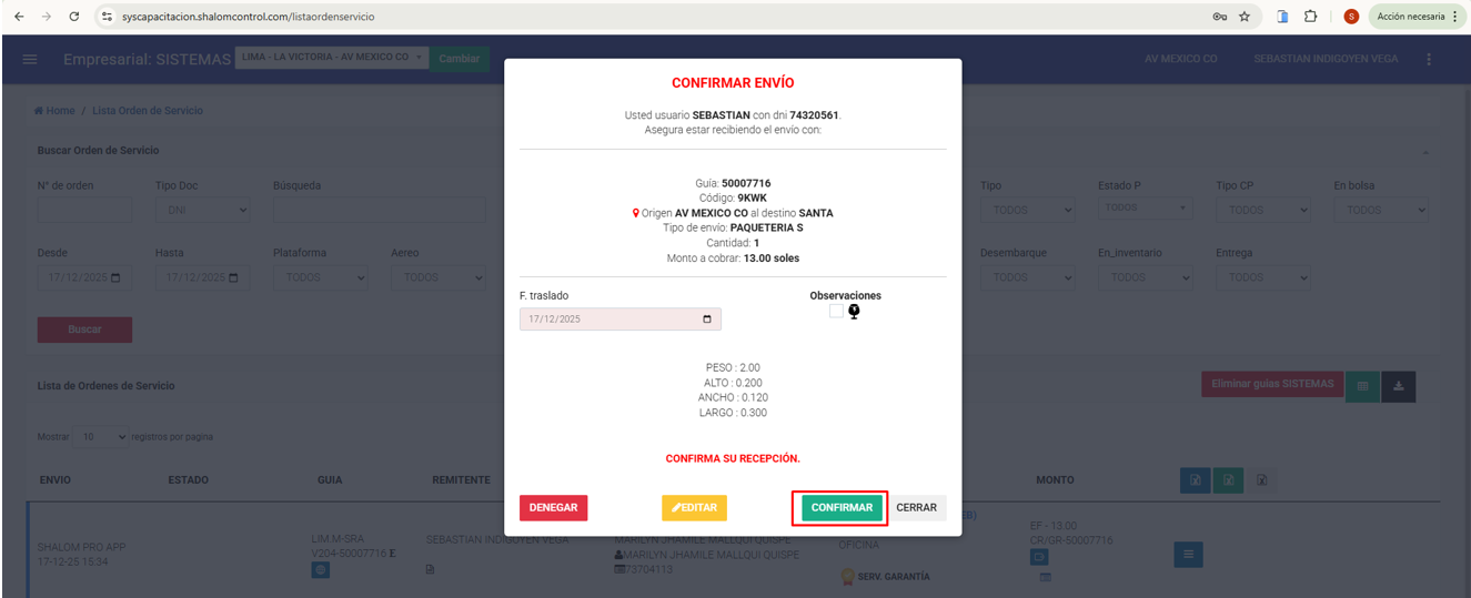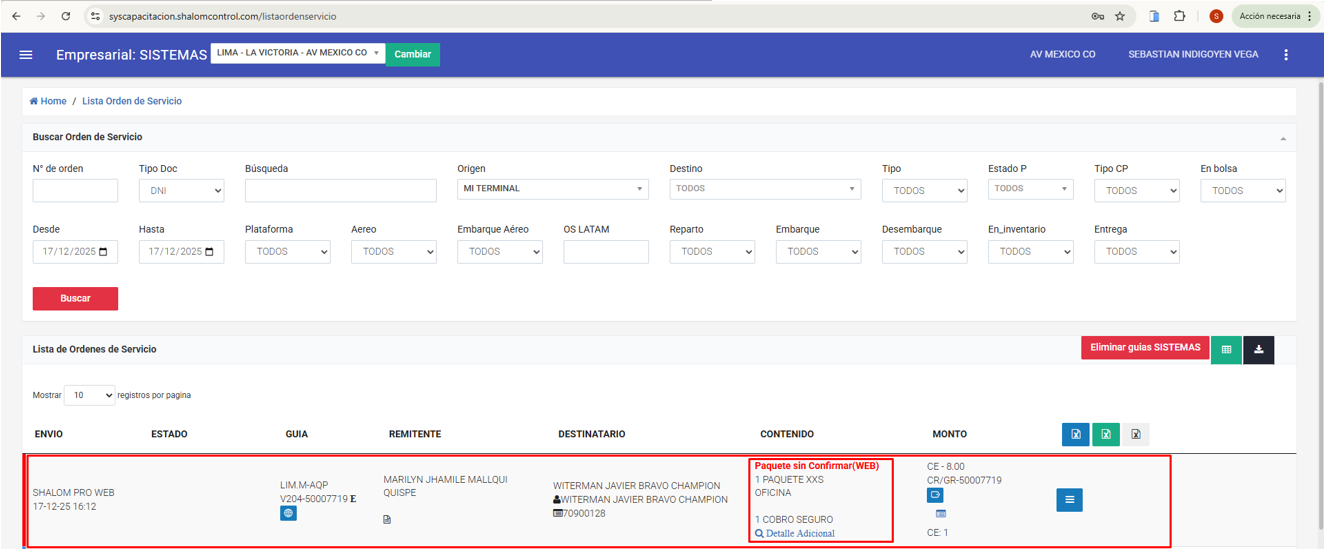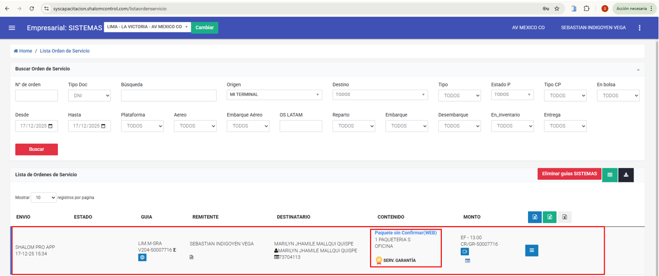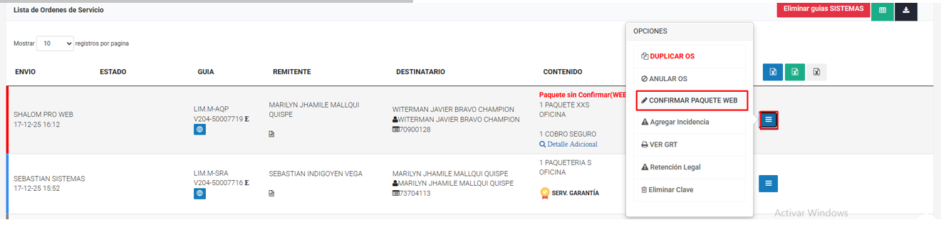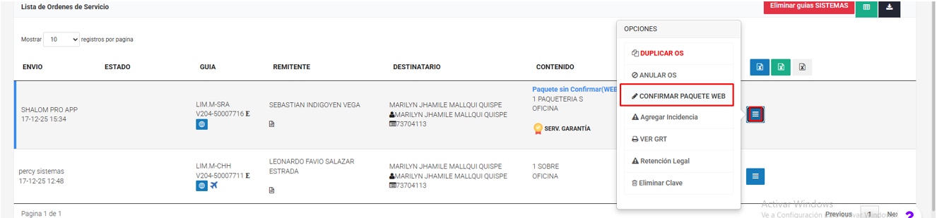 Ingresamos al apartado de lista de servicios podemos observar la creación de la OS para poder Confirmar Paquete Web