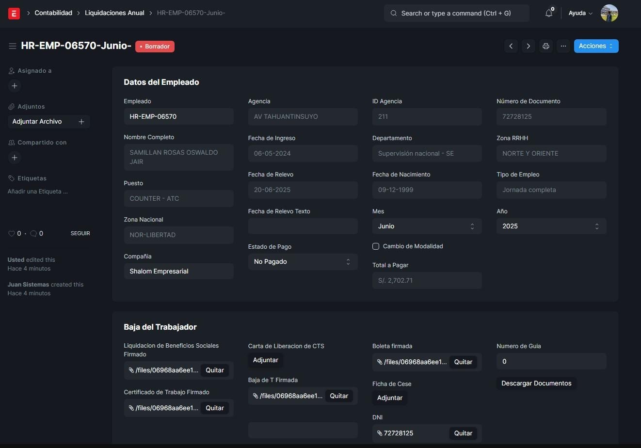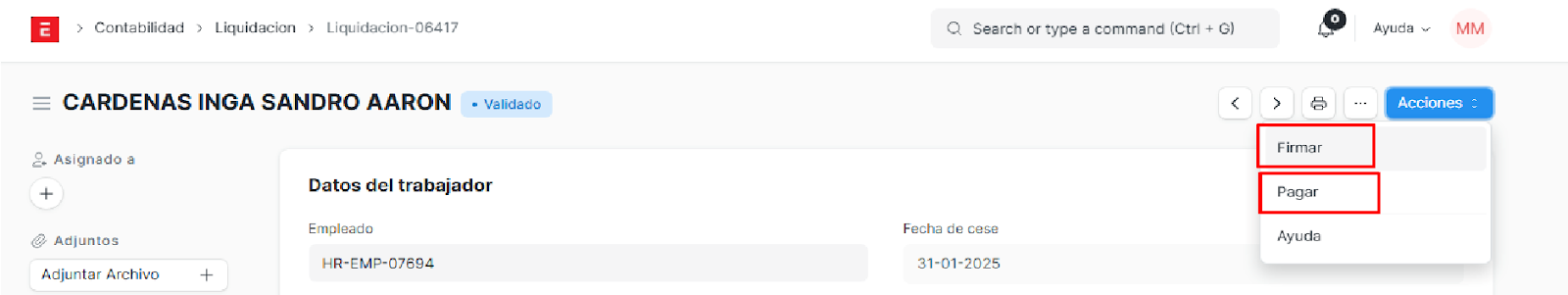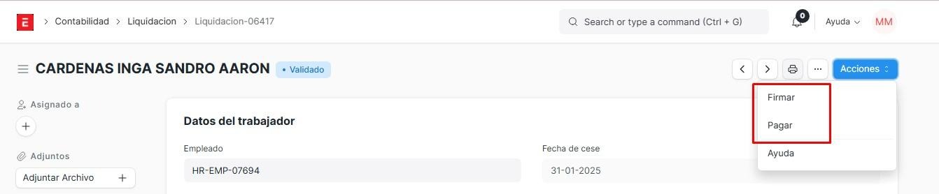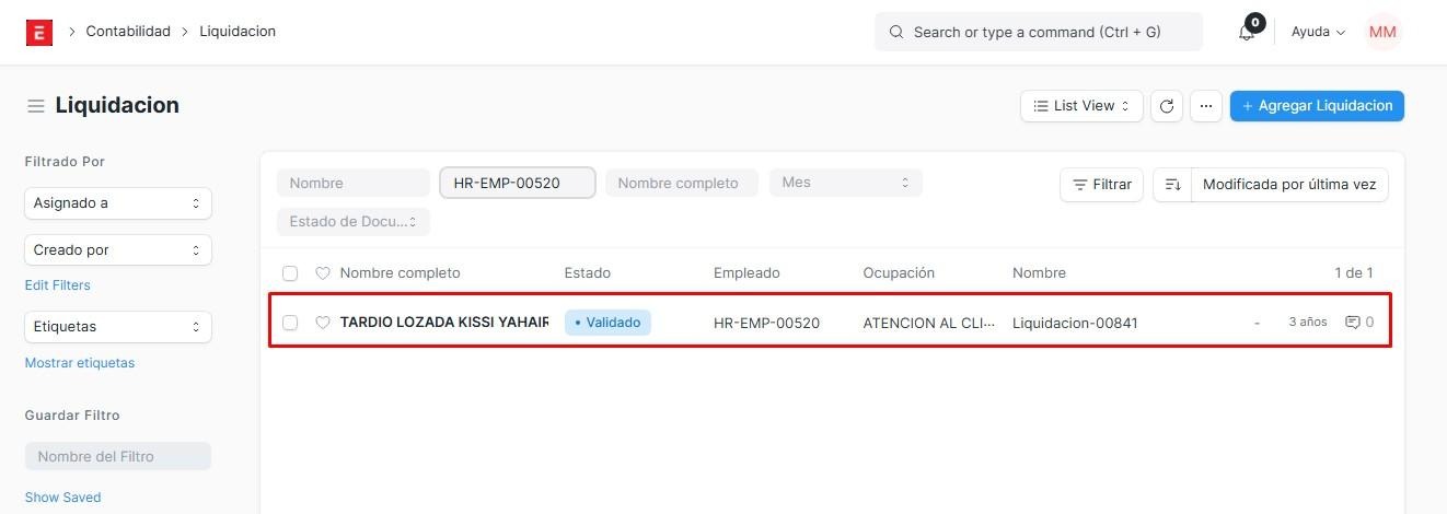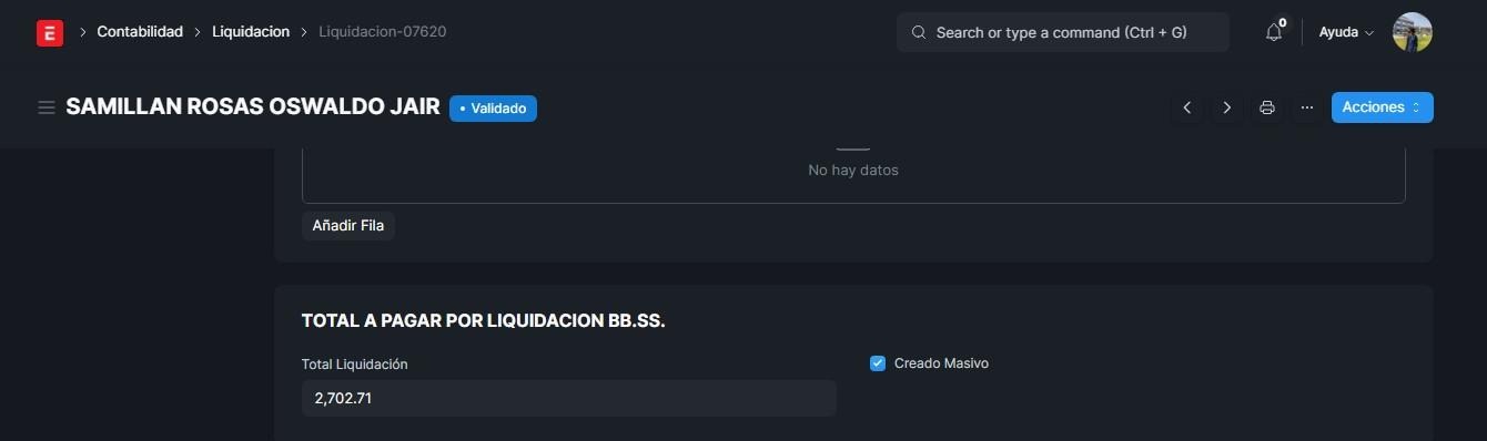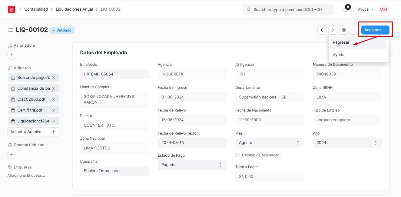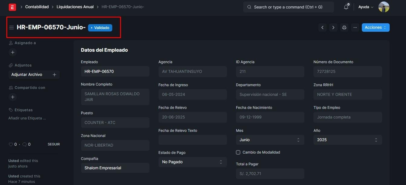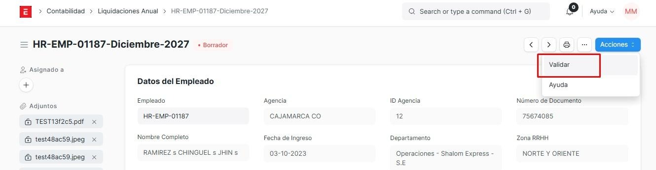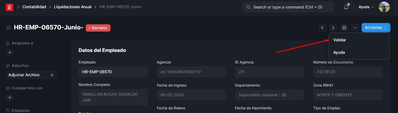 Si nosotros le damos en acciones y click en validar, este empleado pasará a ser validado. Las liquidaciones solo están disponibles para los empleados que tengan 3 meses a más trabajando, caso contrario, no se podrá, con la excepción de que se realice una solicitud de cambio de jornada laboral, para que pueda recibir su liquidación los mese trabajado con esa jornada anterior para pasar a una nueva jornada, iniciando desde cero.
