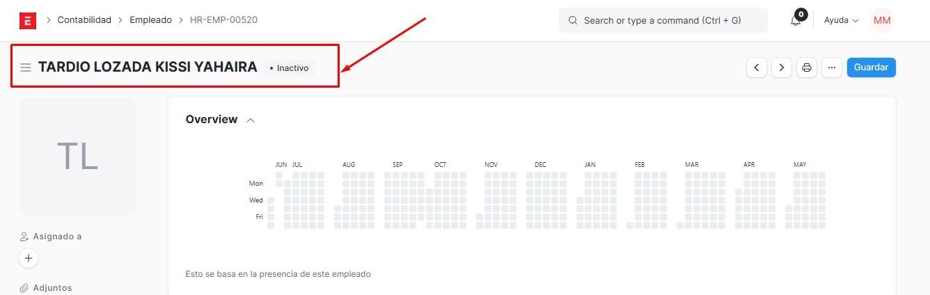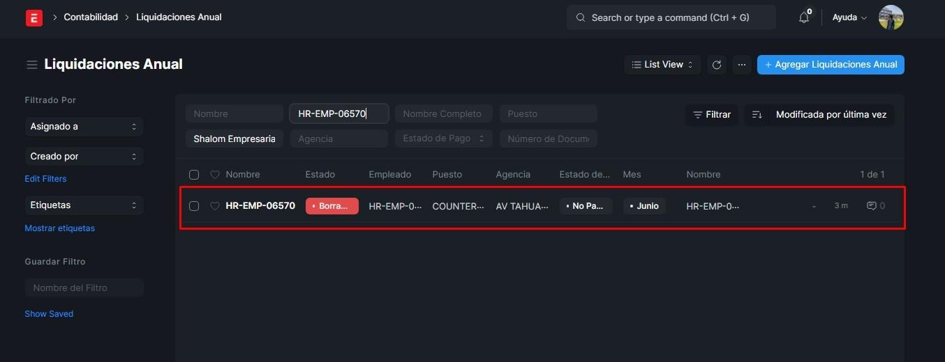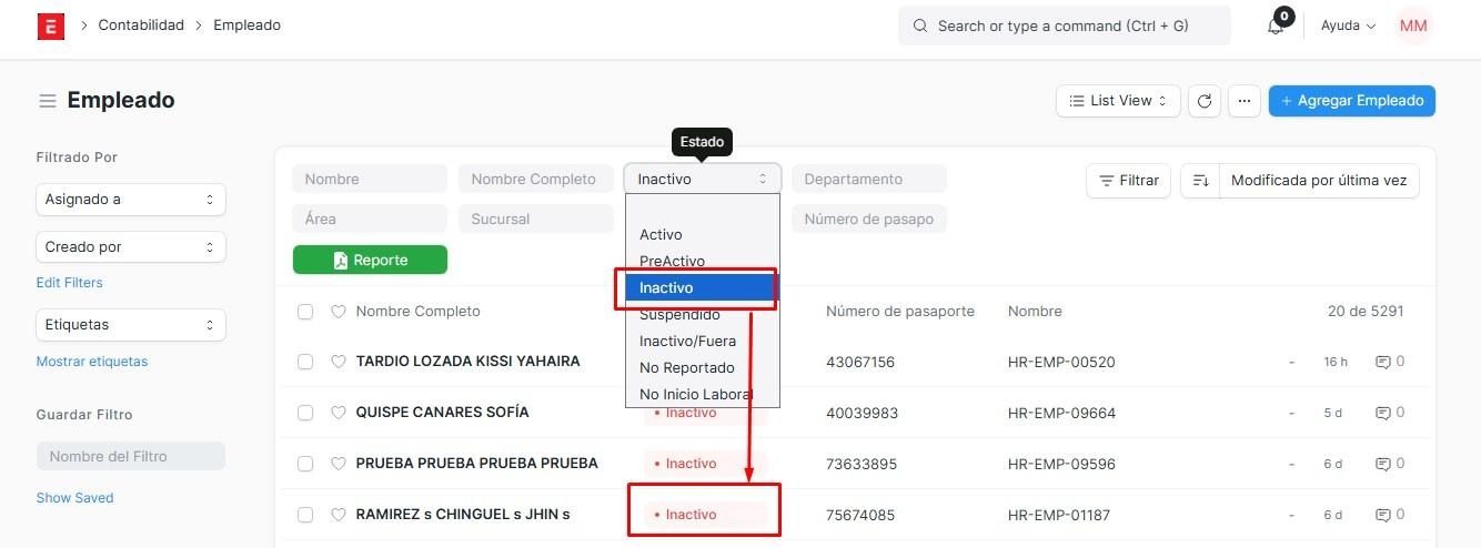 Ahora, si queremos registrar la liquidación para el apartado de liquidaciones anual, es necesario que el empleado se registre desde el sitio web. Primero verificaremos si el empleado está inactivo.