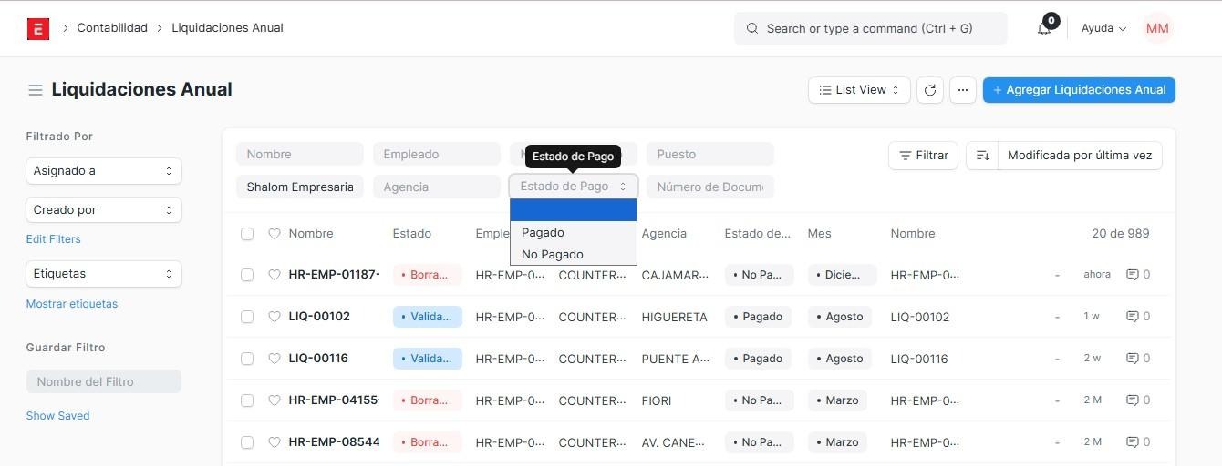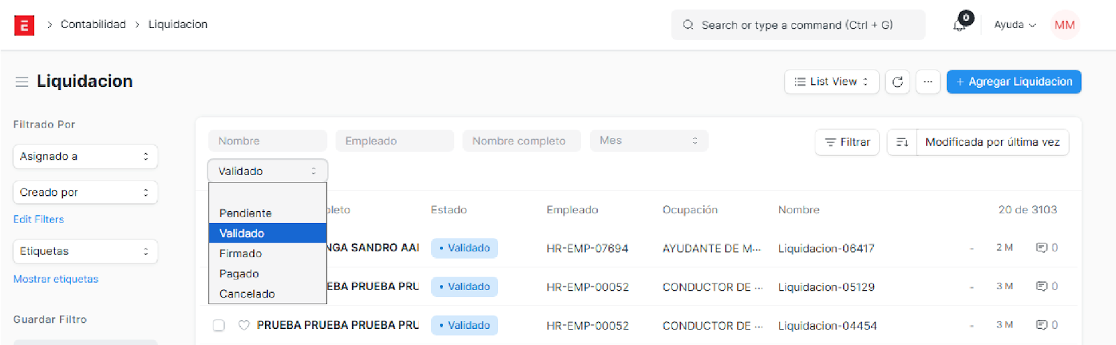 En el apartado liquidación observaremos los siguientes estados de documento: Pendiente, validado, firmado, pagado y cancelado, para que nosotros podamos pagar una liquidación, tiene que tener el estado validado.