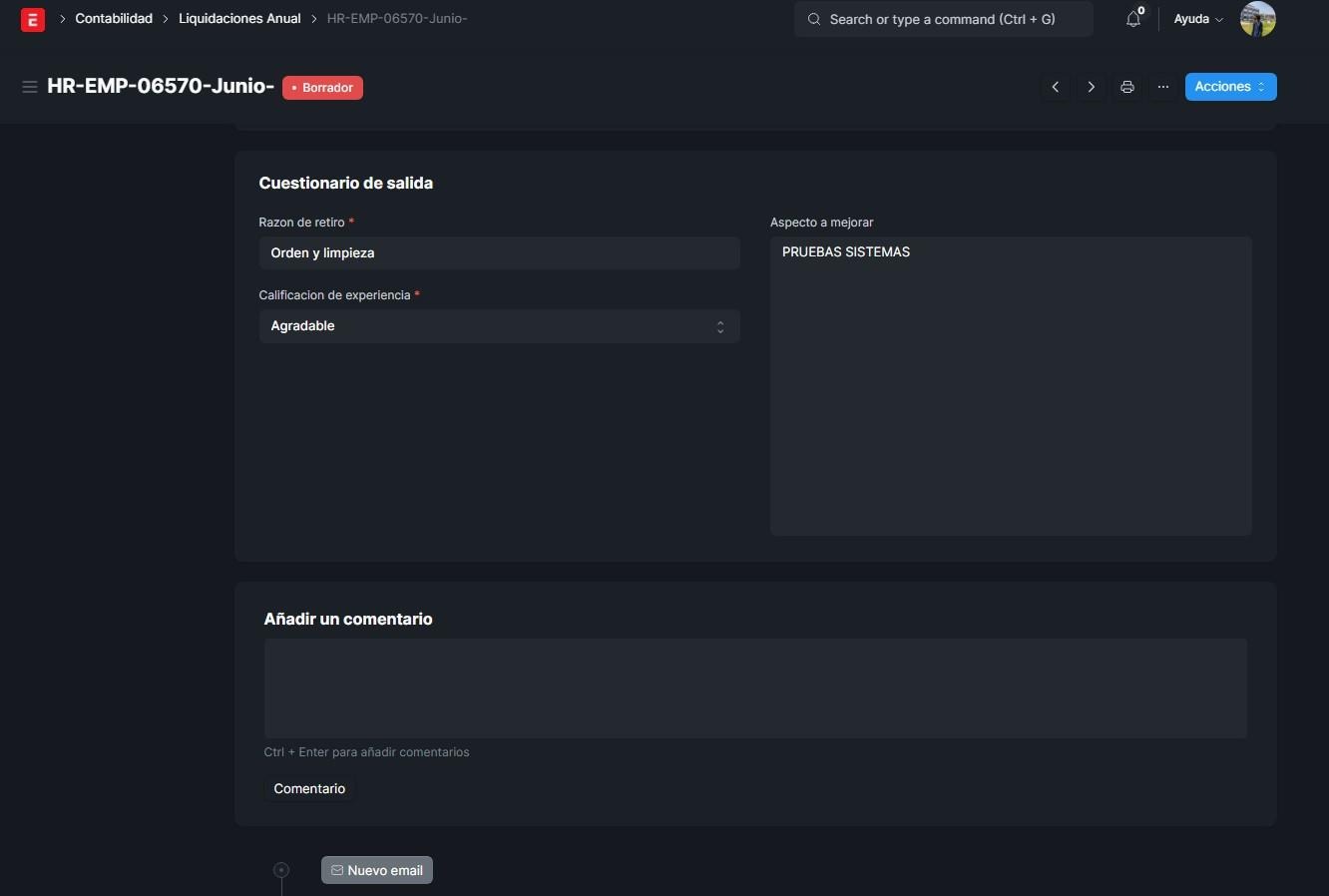 Al dar click en algún empleado podemos cambiar la acción por regresar manualmente, para que este empleado pase al estado borrador.